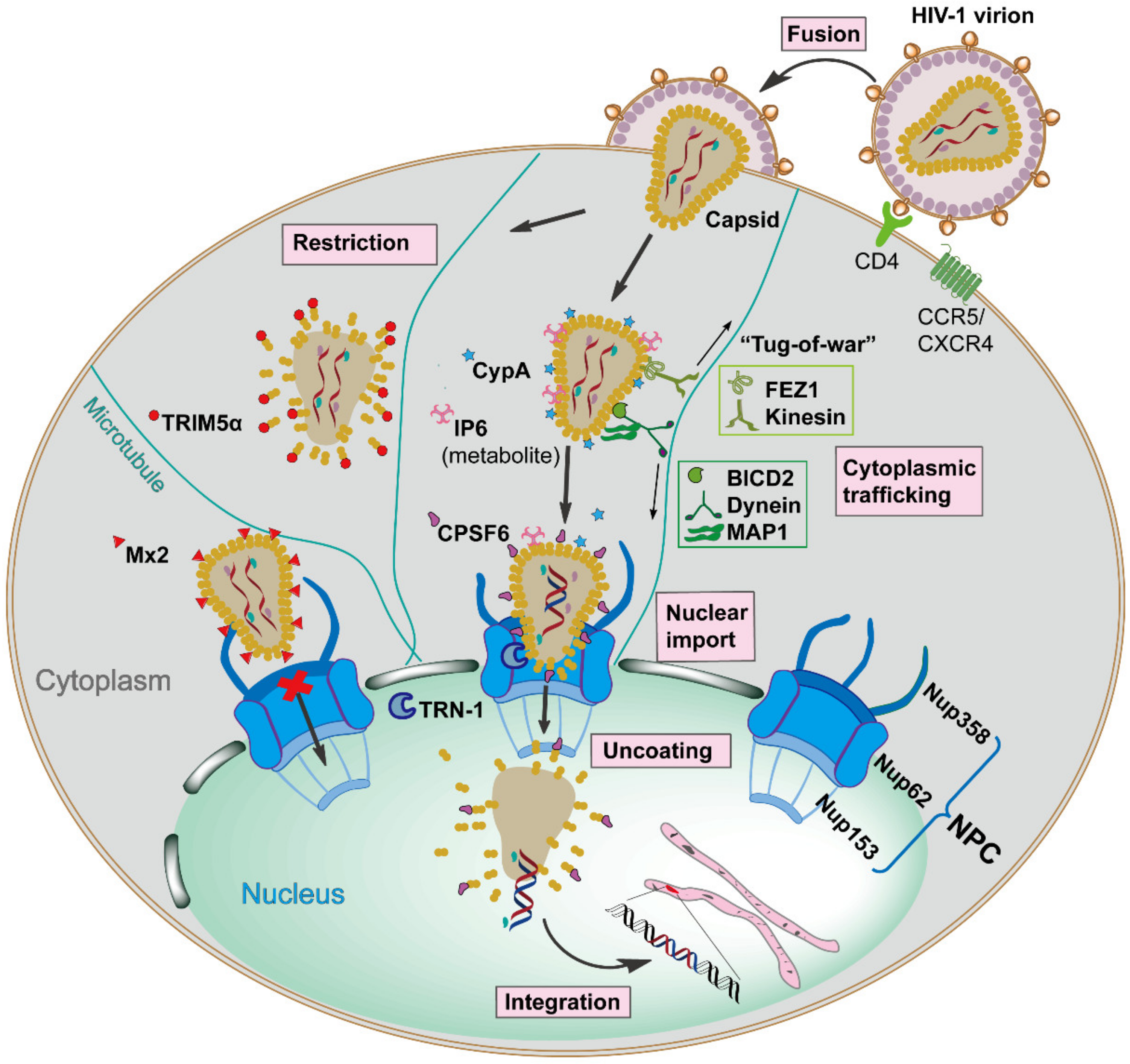 Figure 1. Schematic overview of the early stages of Human Immunodeficiency Virus type 1 (HIV-1) replication, which is spatiotemporally regulated by diverse capsid-interacting host factors.