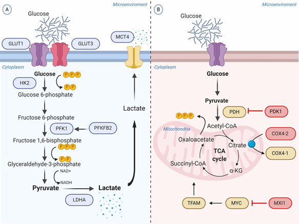 Oxygen is an indispensable factor for aerobic metabolism. After glucose breakdown, the pyruvate into the tricarboxylic acid cycle (TCA), and then the oxygen is used as a terminal electron acceptor in the OXPHOS to produce ATP. Besides ATP, the set of metabolic reactions generates carbon dioxide and a molecule of water. Adaptive responses to deficiencies in oxygenation allow the cells to significantly reduce the amount of pyruvate, which transfers to the mitochondria and switches from OXPHOS to substrate phosphorylation to guarantee the ATP production. The metabolic reaction generates lactic acid as a waste product instead of carbon dioxide [5]. The alternative metabolic pathways confer tumor cells to survive and grow in the microenvironment with oxygen deprivation. Interestingly, tumor cells prefer substrate phosphorylation over OXPHOS even in the conditions with normal levels of oxygen due to this pathway providing cancer cells with important advantages. This process is so-called Warburg effect, known as aerobic glycolysis [40][12]. Despite aerobic metabolism being more productive generating 32 molecules ATP/mol glucose versus two molecules ATP/mol glucose createds through OXPHOS, increased glycolysis flux produces higher amounts of ATP in a shorter time frame [47][13]. It supplies the high demands of energy during tumorigenesis, tumor progression, and metastasis.