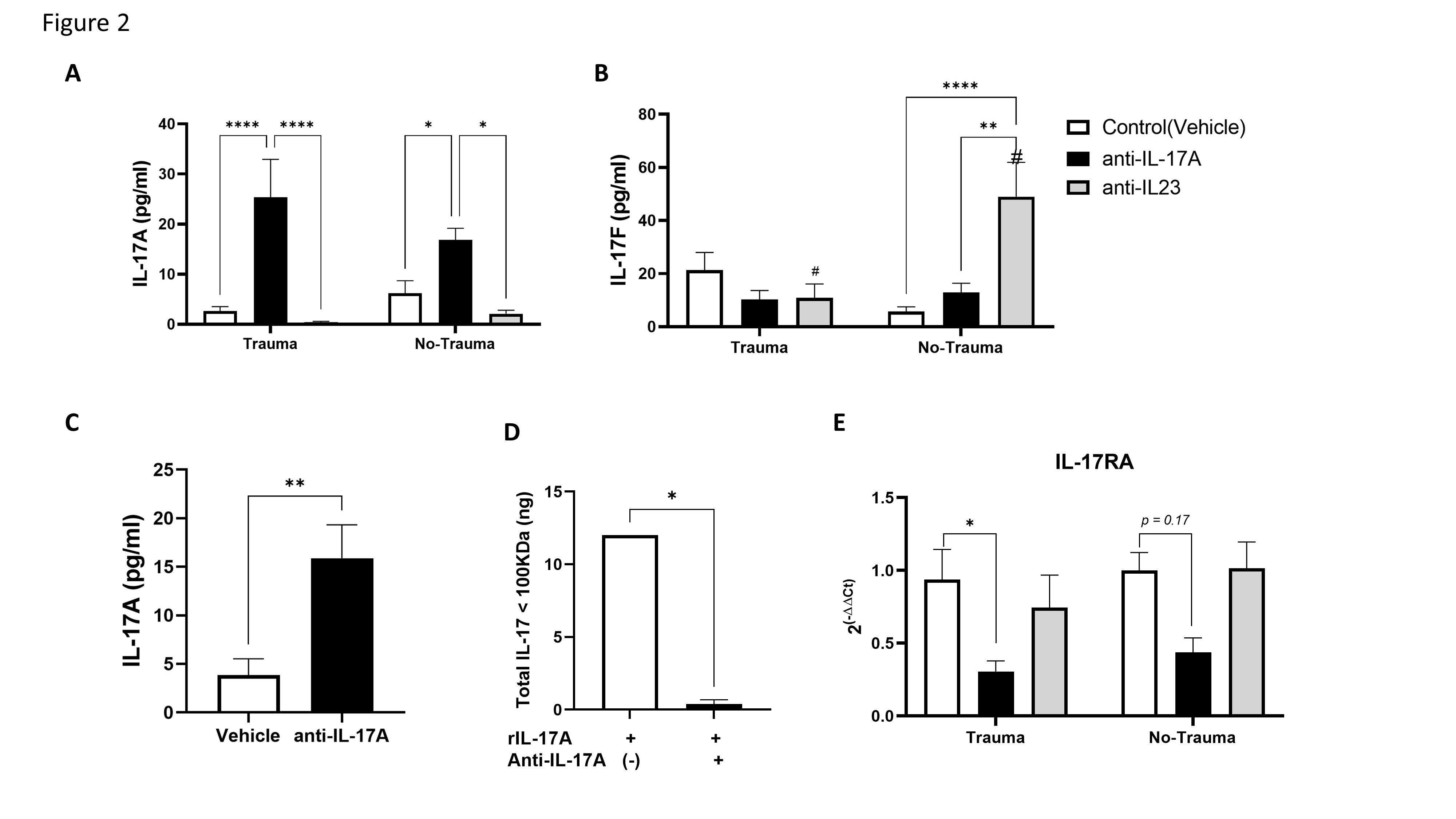 Figure 1. Antibody treatment affects IL-17 serum levels. Serum collected from mice at the end of the experiments (2.5 weeks post-trauma exposure) was analyzed for the protein levels of IL-17A (A) and IL-17F (B) using ELISA assay. Subgroups included pre-treatment with anti-IL17A antibodies (anti-IL17A), anti-IL-23 antibody (anti-IL-23), and vehicle injected animals (Control). (A) A graph presenting IL-17A serum levels detected by ELISA. (B) IL-17F detection of the same sub-treatment groups as described in (A). (C) Serum from control (vehicle treated animals) and anti-IL-17A treated animals was size filtered with 100 KDa cut-off membrane filter. The serum fraction containing protein complexes > 100 KDa was assayed for IL-17A levels using ELISA. The graph depicts the resulted concentrations. (D) A graph presenting the total amount of recombinant murine IL-17A that was filtered by a 100 KDa membrane filter with or without pre-incubation with anti-IL17A antibody (1:1 ratio). A total amount of 20 ng rIL-17A was filtered, and filtrate was analyzed by IL-17A ELISA with the total amount of protein calculated. (E) A graph presenting the relative gene expression for IL-17 receptor A (IL-17RA) in the hippocampus of animals from all treatment groups sacrificed 2.5 weeks post-trauma exposure, as detected by real-time PCR on hippocampal RNA. All data in the graphs is presented as mean ± SE. *p < 0.05, **p < 0.01, ****p < 0.0001,. Paired symbols represent statistical significance between the two corresponding groups: #p < 0.05.