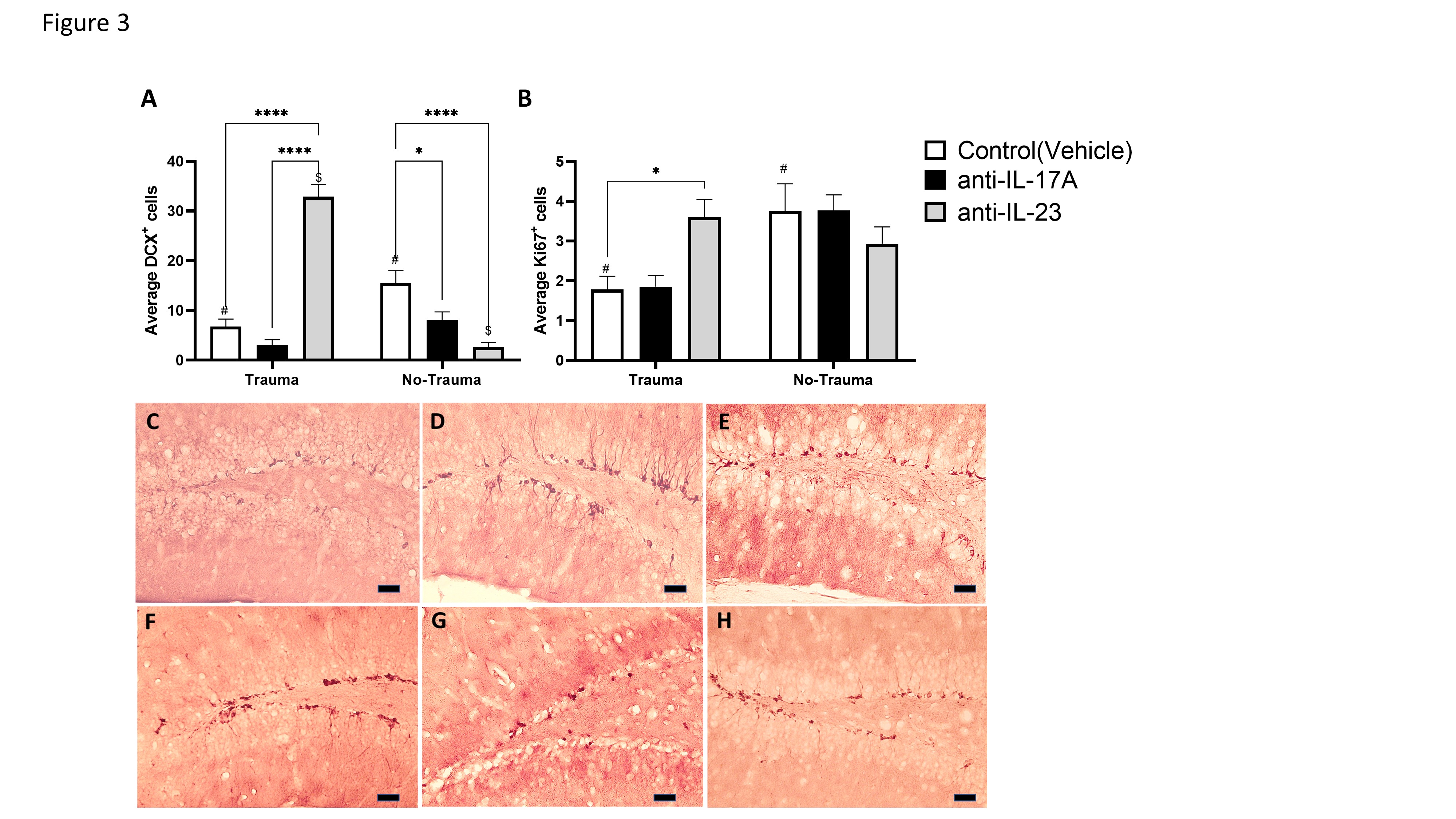 Figure 2. Exposure to trauma and antibody treatment affect hippocampal neurogenesis. Hippocampal neurogenesis was assessed by immunohistochemistry for proliferating neuro-progenitors (Ki67) and early differentiating neurons (DCX). (A) A graph presenting the average number of positive Ki67 cells in the sub-granular zone per hippocampal slide. (B) A graph presenting the average number of positive DCX cells in the granular cell layer per hippocampal slide. Representing micrographs of DCX- stained hippocampi from trauma exposed mice treated with anti-IL-17A (C), anti-IL-23 (D), control (vehicle) (E) and control (no trauma) mice treated anti-IL-17A (F), anti-IL-23 (G) and control (vehicle) (H). All data in the graphs is presented as mean ± SE. *p < 0.05, ****p < 0.0001. Paired symbols represent statistical significance between the two corresponding groups: $p < 0.05, #p < 0.05. Scale bars represent 20 μm.