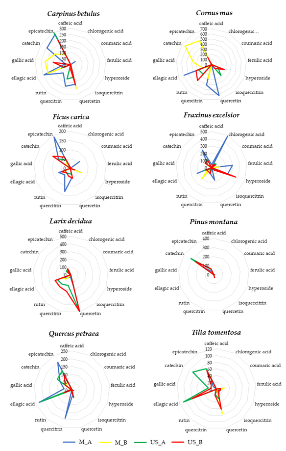 In this study, the health-promoting compounds were grouped into four different polyphenolic classes in order to assess the contribution of each class to the phytocomplex composition of buds belonging to the eight different species: cinnamic acids (as sum of caffeic acid, chlorogenic acid, coumaric acid, ferulic acid), flavonols (as sum of hyperoside, isoquercitrin, quercetin, quercitrin and rutin), benzoic acids (ellagic and gallic acids) and catechins ((+)catechin and (-)epicatechin). The identification and quantification of each single bioactive compound is shown in Figure 5 which shows the radar plot, made considering for each botanical species the mean values obtained from the 4 different extracts (M_A, M_B, US_A, US_B) for each marker compound quantified.
