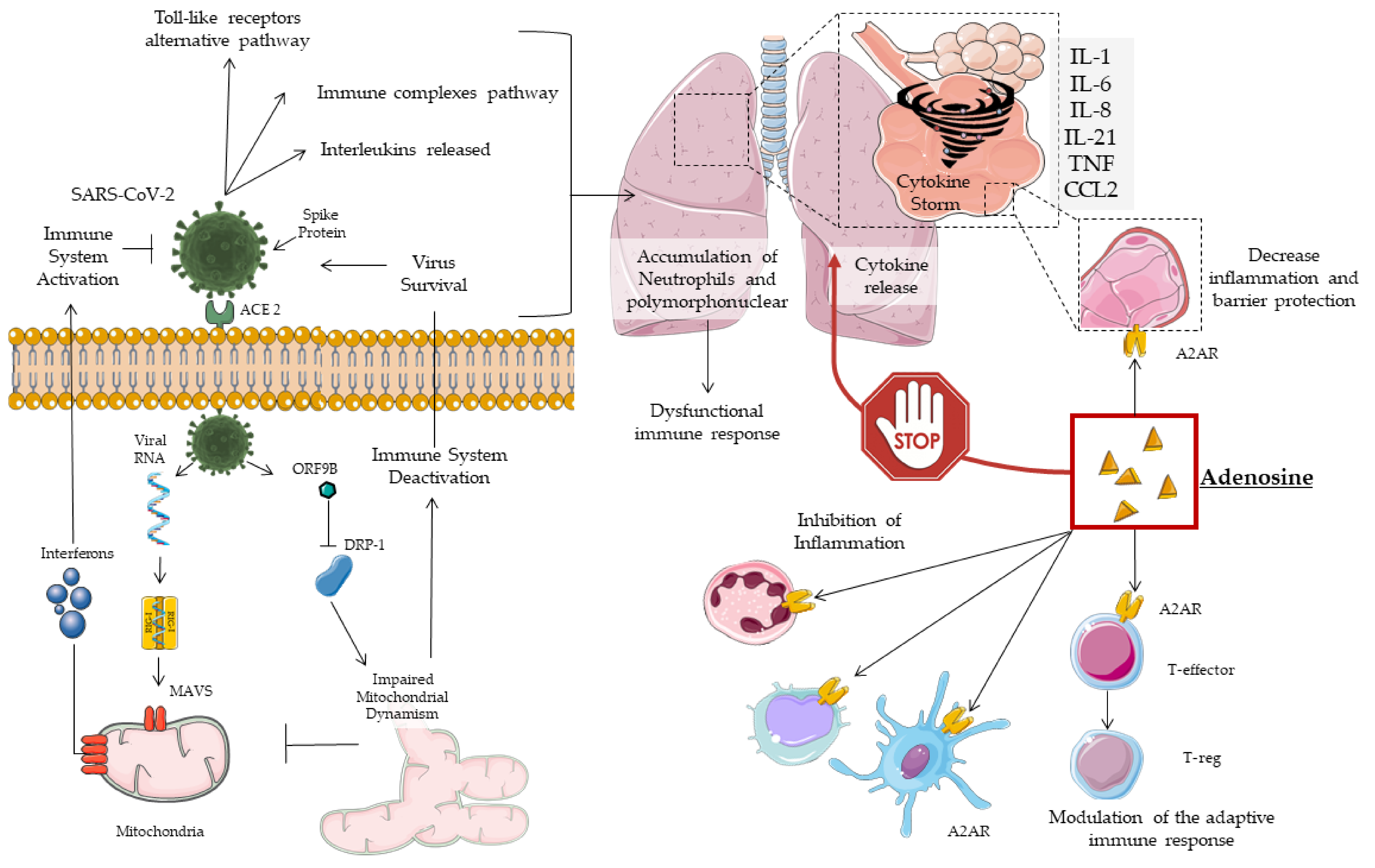The A2A subtype is the most common in the human body [72], and its expression is increased in case of damage, especially in macrophages [73]. In SARS-Cov2 the infection of the alveolar epithelium immediately involves the nearby endothelial cells and alveolar macrophages. A release of pro-inflammatory molecules is triggered, with an inflammation affecting the alveolar cellular architecture. This attracts monocytes, macrophages, and T cells to the infection site, promoting an increase in inflammation. In some patients, a dysfunctional immune response leads to an accumulation of immune cells in the lungs and the death of lung tissue due to an overproduction of pro-inflammatory molecules. The conditions of multi-organ damage mediated by the cytokine storm and the inability of the host to prevent the spread of the virus are still configured at a systemic level [4]. Therefore, adenosine can help control the inflammatory response and, in turn, increase the response of the host against the virus. Antiviral and regulatory therapies for a dysfunctional immune system could act in synergy by blocking replication and reducing clinical severity [4]. The cellular responses are different: coronary vasodilation, platelet aggregation inhibition, inhibitory modulation, non-redundant [74], acute immune response against T cells, monocyte, macrophages, PMNs, and dendritic cells [75]. The role of A2A in protecting lung integrity from the acute inflammatory process is evident. In fact, the activation determines the suppression of the immune response, the reduction of microvascular permeability and capillary filtration of the lung, preservation of fluid homeostasis, increased clearance of alveolar fluids, and inhibition of trans epithelial leukocyte migration [3][76]. In acute inflammation, the evaluation of alveolar bronchial lavage has shown that the activation of A2A determines a reduction in the secretion of IL-6, TNF-α, and chemokine (C-X-C motif) ligand 3 (CXCL1-3) [77]. The A2B subtype is widespread in the body, strongly expressed in the vascular compartment and macrophages, but with a lower affinity. More generally, it has been observed that adenosine is able to promote the processes of angiogenesis and vasculogenesis through the stimulation of VEGF, especially following damage to the endothelium. Furthermore, in conditions of stress, adenosine is an effective vasodilator, able to regulate the vascular traffic of leukocytes, and plays a role in protecting the lung from mechanical ventilation [78][79]. The damage related to mechanical ventilation has been attributed to an excess of pressure or volume, which is responsible for the “shear stress” to the lung parenchyma. This results in an inflammatory cascade against, in which adenosine could play a protective role.