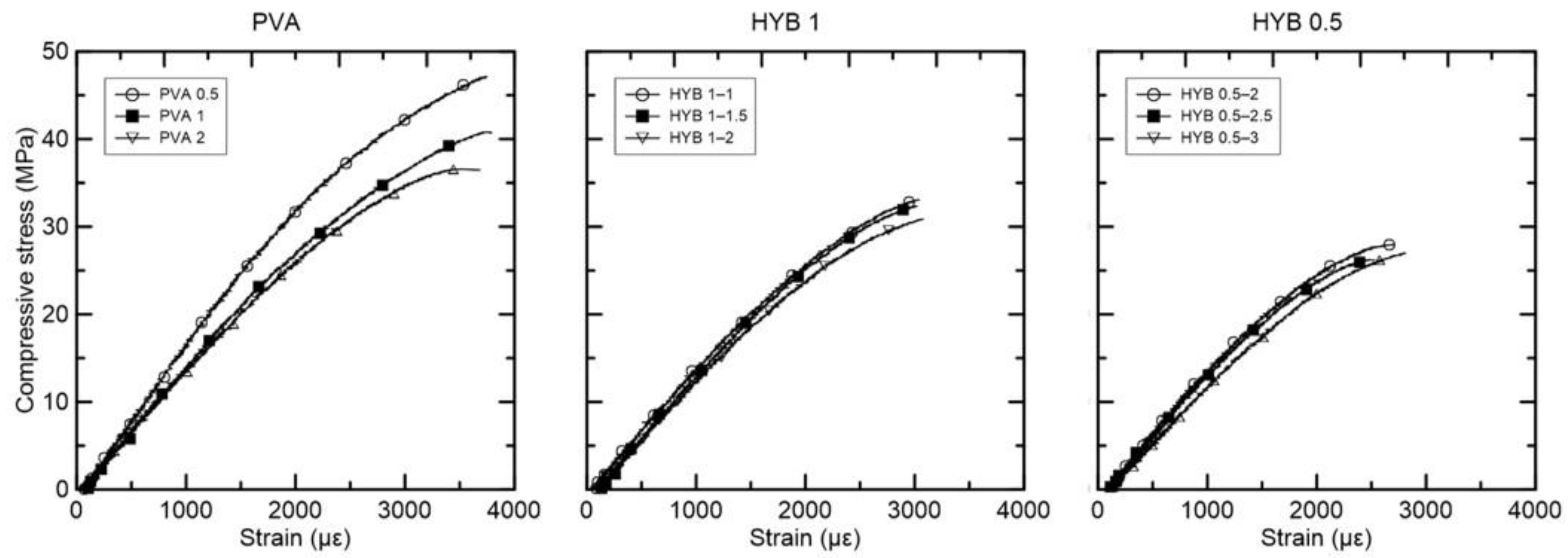 Figure 3 presents the compressive stress versus strain curves for the composites reinforced with PVA, HYB 1, and HYB 0.5. In the case of hybrid composites, all compositions presented lower compressive strength in comparison to only-PVA fiber composite, which is related to higher fiber volume in total. In the case of hybrid compositions, the total fiber volume was crucial for average compressive strength. Thus, the hybrid compositions with 0.5% PVA fiber presented lower values of 29.59 MPa for 2.5%, 29.74 MPa for 3%, and 26.26 MPa for 3.5% total fiber volume. The hybrid compositions with 1% PVA presented average compressive strength values of 32.24 MPa for 2%, 31.93 MPa for 2.5%, and 29.77 MPa for 3% total fiber volume. In addition, it can be noted that the composite HYB 1–1.5 presented higher compressive strength compared to HYB 0.5–2%. This suggests that the effect of PVA on strength is different for curaua fiber, considering that the composite with 1% curaua presented lower compressive strength than the composite with 0.5% PVA, though both had the same total fiber amount.