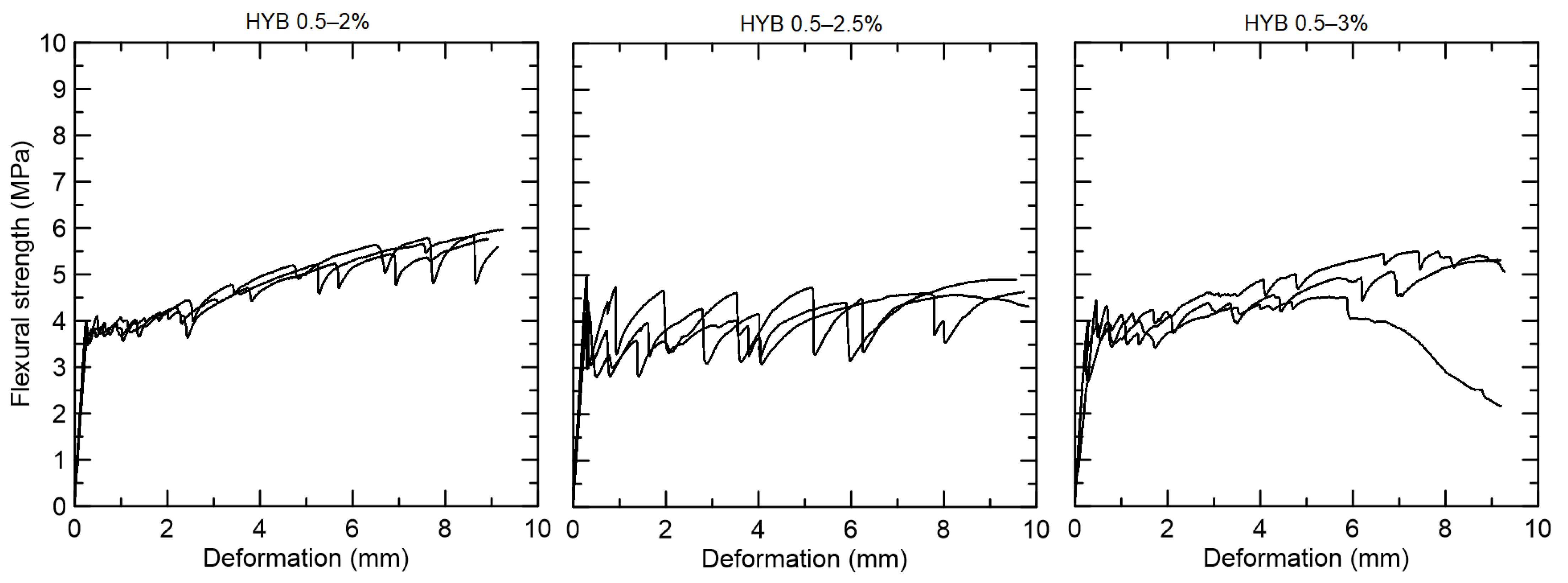 Figure 5). The specimens presented deflection-hardening behavior with a flexural strength at first crack equal to 3.90 MPa for HYB 0.5–2, 4.49 MPa for HYB 0.5–2.5, and 3.92 MPa for HYB 0.5–3. All groups presented lower flexural strength at the first crack in comparison with only-PVA 0.5% fiber composite (5.18 MPa).