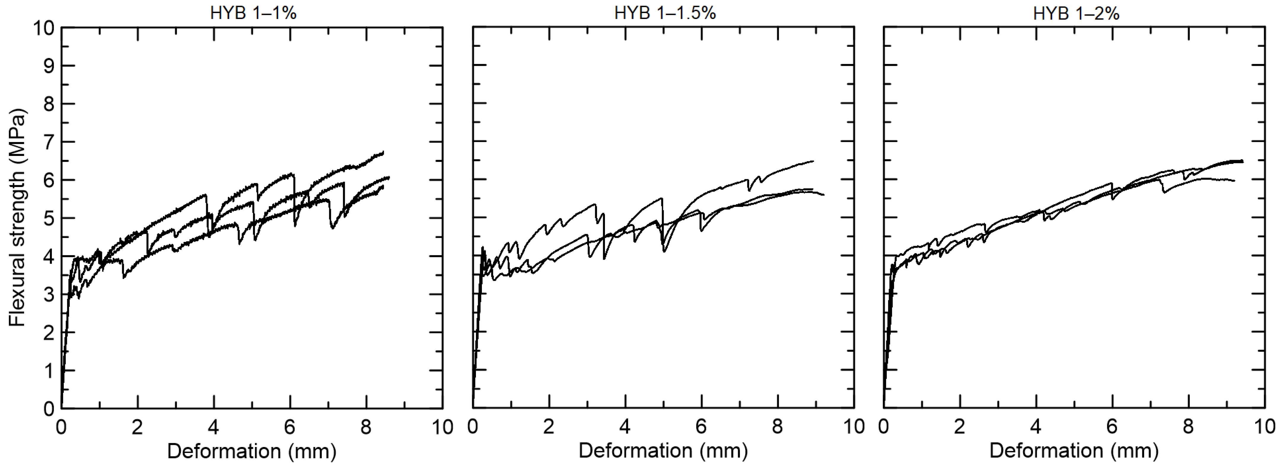 Figure 6). The flexural strength at the first crack was equal to 3.56 MPa for HYB 1–1, 4.01 MPa for HYB 1–1.5, and 3.96 MPa for HYB 1–2. The flexural strength at first crack was lower in comparison with only-PVA 1% fiber (5.77 MPa), with a post-cracking strength superior to 6 MPa for all mixtures tested.