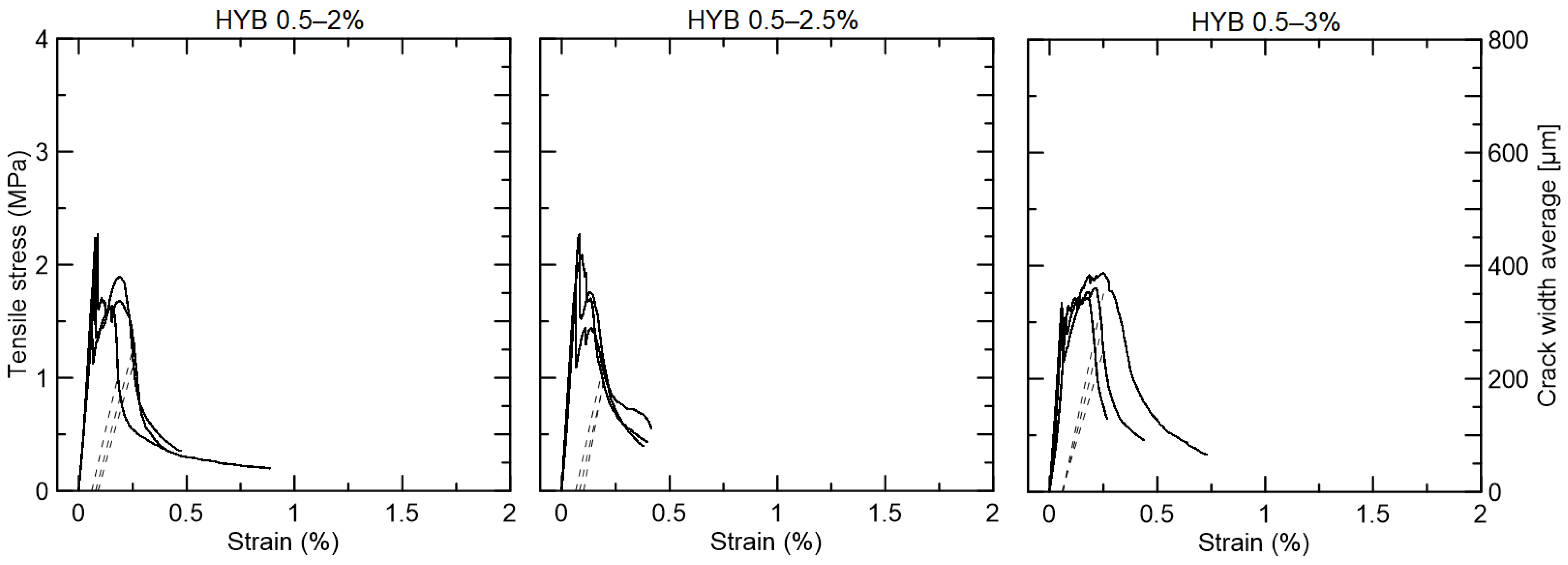 Figure 9). The group with 1% curaua cracked at 1.39 MPa and improved up to 1.91 MPa, but without crack width control. The most promising group was HYB 1–1.5, which was 1% PVA and 1.5% curaua. This group presented strain-hardening behavior, with the first crack strength at 1.92 MPa and a maximum strength reaching 2.53 MPa. Moreover, the average crack width was controlled below 250 µm, up to 0.6–1% of strain capacity. The hybrid composition with 2% curaua also presented strain-hardening behavior from 1.84 MPa to 2.23 MPa, but with a strain capacity of lower than 0.5%.