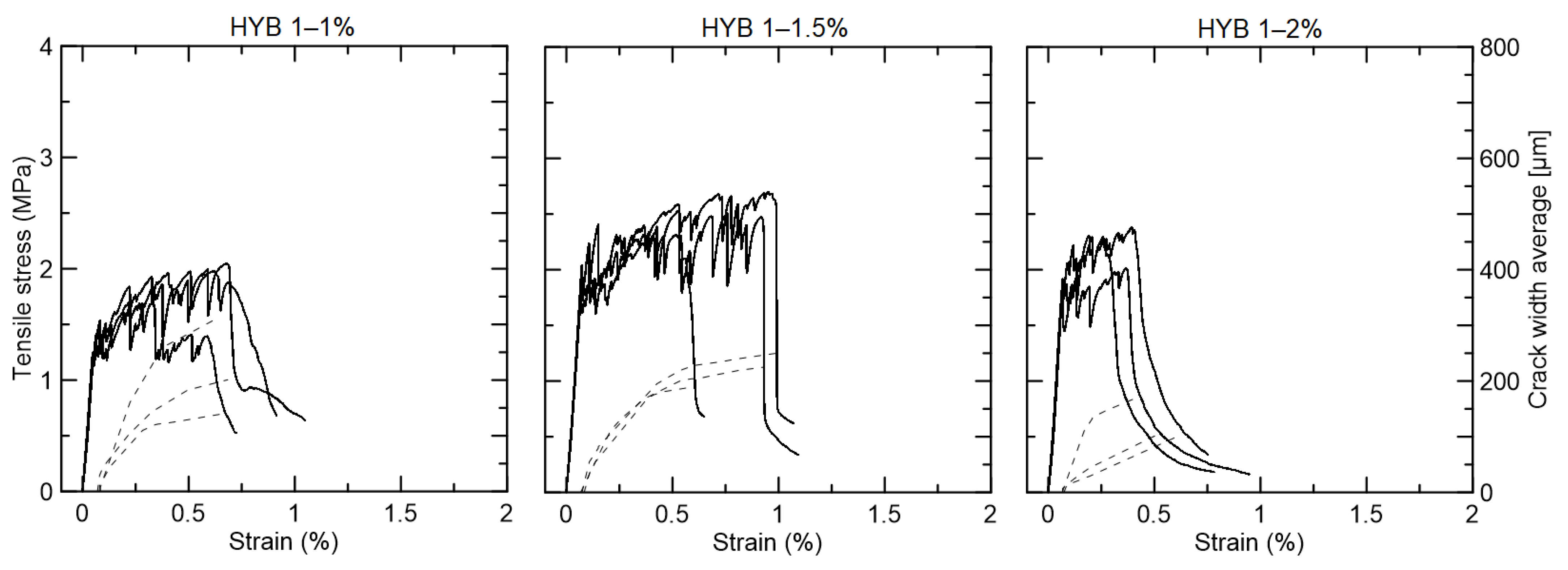 Figure 9. Tensile strength (continues line) versus strain curves and average crack width (dotted line) for the hybrid composites reinforced with 1% PVA and 1%, 1.5%, and 2% curaua fiber.
