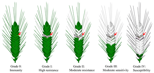 Figure 2. Grades of resistance to and severity of FHB in wheat. According to the severity of FHB on wheat spikes, the severity of the disease and the resistance level of the plant were divided into five grades: grade 0, I~IV, which represents the percentage of diseased spikelets as zero, less than 1/4 (<25%), 1/4~1/2 (26−50%), 1/2~3/4 (51−75%), and more than 3/4 (>75%) in turn. Meanwhile, the numbers also correspond to the different FHB resistance levels of the plant. (Please refer to the detailed information in GB/T 1576-2011 of China). Red arrows indicate sites inoculated with Fg.
