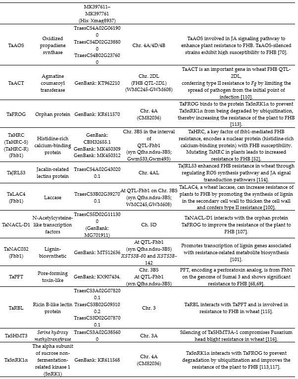 So far, although hundreds of QTLs for FHB resistance have been mapped onto wheat chromosomes, it is a challenging task to segregate them using forward genetics. At present, the more well-defined QTLs for resistance to FHB in wheat are Qfhb.nau-2B [75], Fhb1~Fhb7 [85], Qfhs.ndsu-3AS [88], QFhb-5A [55], and so on (Table 1). Among them, the first identified and the best validated resistance QTL is Fhb1, which is employed as the most important FHB resistance donor worldwide [52,89]. Therefore, several approaches have been carried out to identify candidate genes in Fhb1 by transcriptome-based analysis and map-based cloning. For example, the genes encoding a pore-forming toxin-like proteinPFT [68,69], a laccase TaLAC4 [100], and a NAC (N-acetylcysteine) class transcription factor TaNAC032 [101] were all positioned within QTL-Fhb1 and conferred to FHB resistance. In addition, two putative histidine-rich calcium-binding proteins, TaHRC and Qfhs.njau-3B, were also found underlying in QTL-Fhb1, but they conferred FHB susceptibility. On the contrary, mutants of them conferred FHB resistance [52,89].