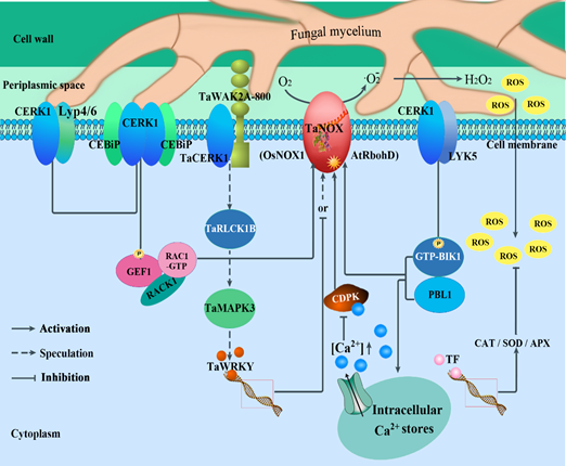 Based on these results, CERK1-mediated signaling models were constructed as shown in Figure 4, in which the regulation patterns of NOXs/RBOHs activity and maintenance of intracellular ROS homeostasis during plant response to FHB stress), will offer valuable information for further studies in this field and provide important cues for crop improvement by genetic engineering and molecular breeding during agricultural practices.