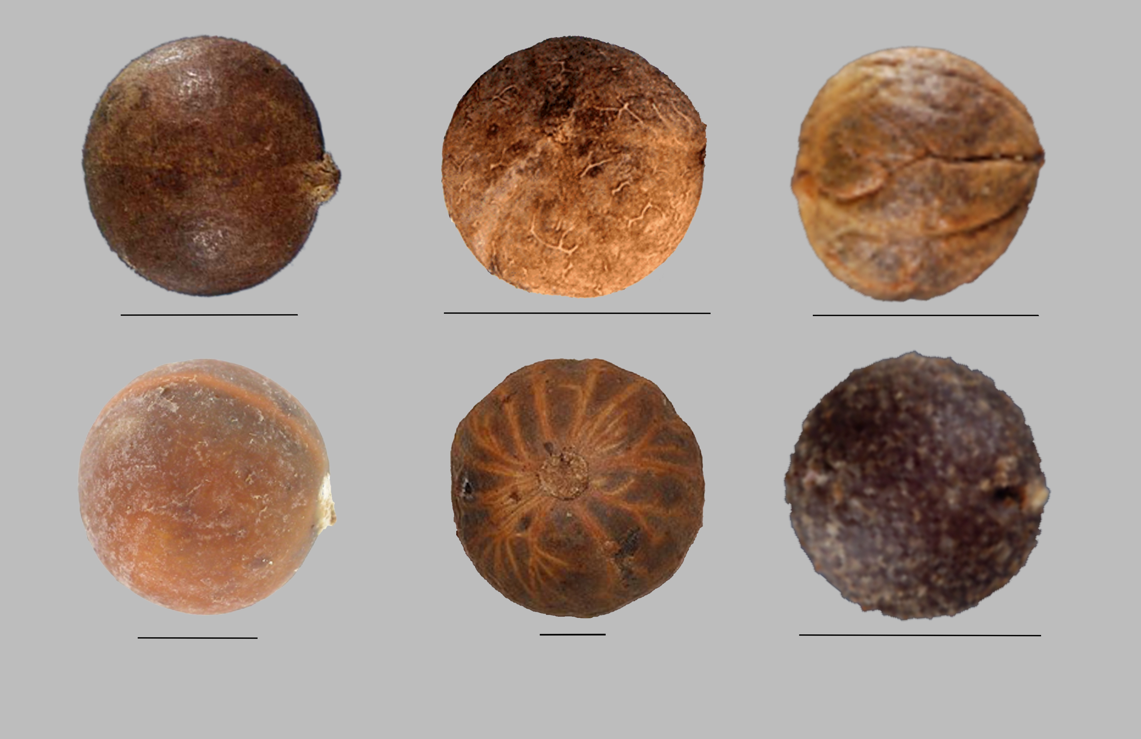 Figure 2. Representative examples of round seeds (J index values are indicated between parentheses). From left to right: Acoelorrhaphe wrightii (93.6), Acrocomia aculeata (95.7), Coccothrinax argentata (92.6), Geonoma congesta (96.1), Iriartea deltoideia (95.3), and Thrinax radiata (95.4). The seed of Iriartea deltoidea is oriented with the attachment of the peduncle in a frontal position. In the other seeds, the place of attachment of the peduncle is in a lateral position. Bars represent 0.5 cm.