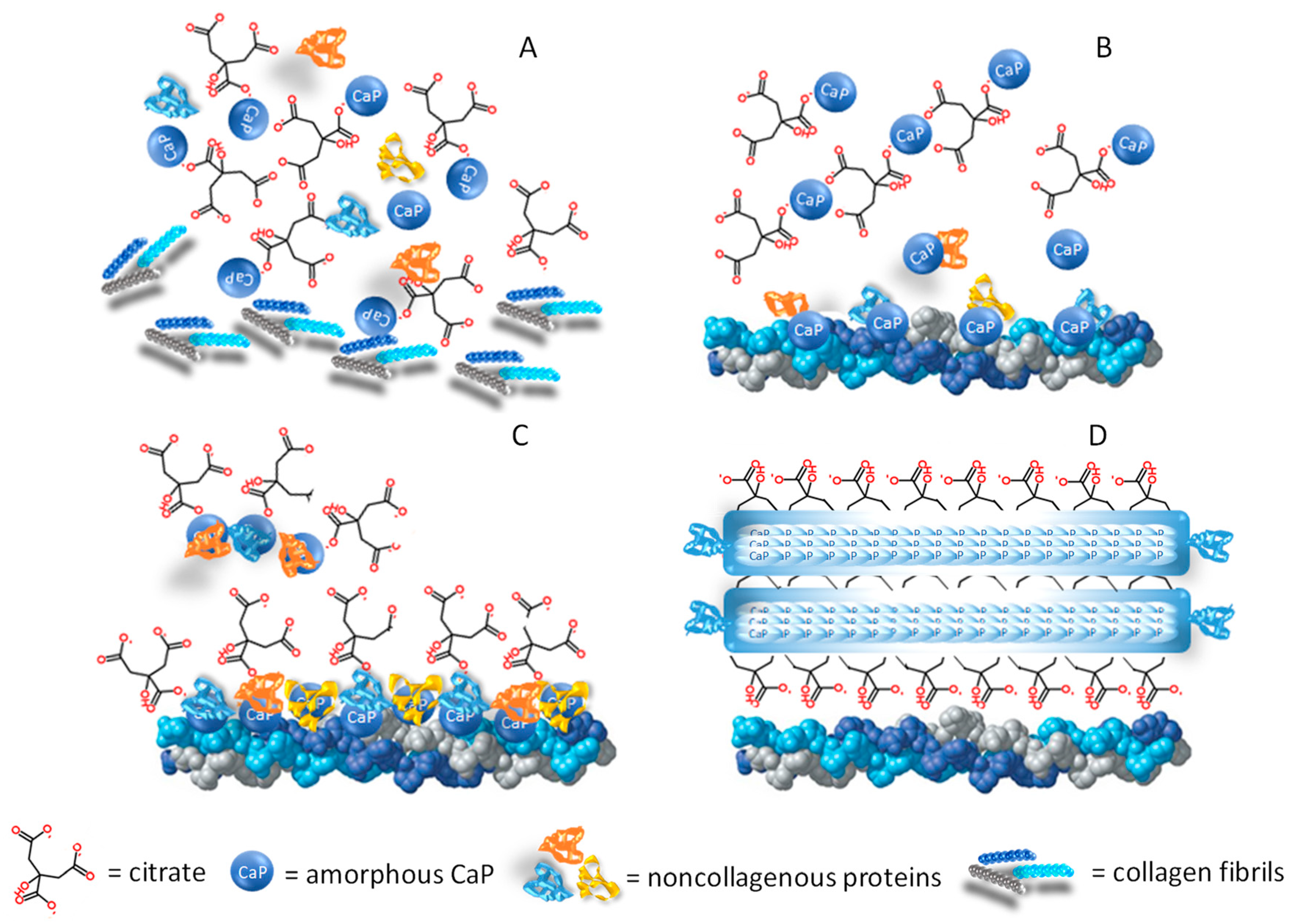 Figure 3. Citrate in the formation of the mineral matrix. (A) The amorphous calcium-phosphate (CaP) phase originates from an oversaturated CaP solution, and the mineralisation process starts when the organic phase (citrate, collagen fibrils, and noncollagenous proteins) is available in the bone microenvironment. (B) At the early stage, few citrate molecules bind with the amorphous CaP and the particle aggregation is slowed down. (C) In the next phase, the noncollagenous proteins released from bone cells favour CaP aggregation and apatite nucleation while the collagen promotes the self-assembly of CaP and guides the aggregate deposition on the collagen surface. (D) When the surface is fully covered by citrate, the thickness increase is inhibited (2–6 nm), while longitudinal growth continues up to 30–50 nm, thus explaining the flat morphology of bone mineral platelets. In addition, citrate forms bridges between the mineral platelets which can explain the stacked arrangement which is relevant to the mechanical properties of bone.