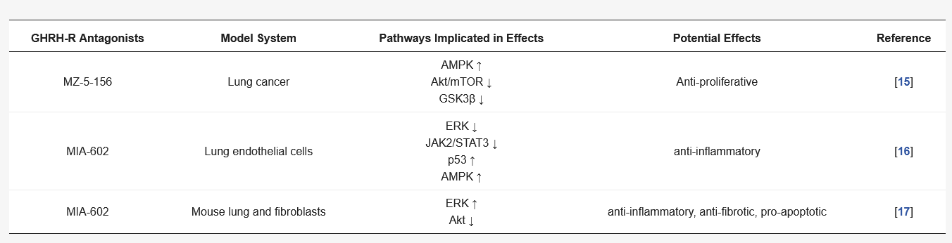 Several peptide GHRH-R agonists and antagonists have been developed in the laboratory; we have utilized some of these to identify specific pathways and their effects regarding the actions of GHRH in lung inflammation, fibrosis, and cancer, as we describe in the section below. Many GHRH-sensitive signaling pathways operate in the lung. These link lung inflammation, mitochondrial function, apoptosis, and fibrosis after injury with the effects of GHRH. Pathways relevant to lung inflammation, fibrosis, and cancer and the effects of GHRH-R antagonists are summarized in Table 1