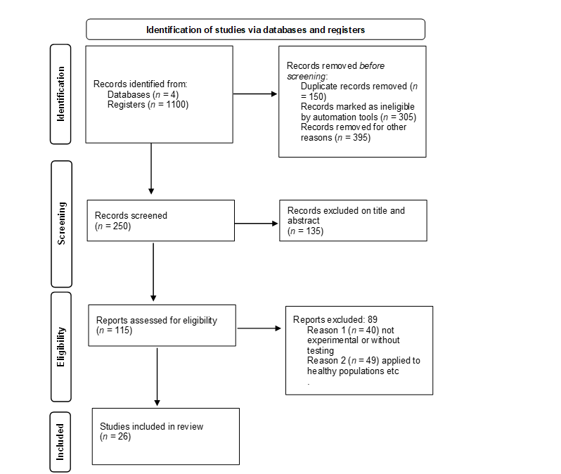 A total of 115 initial studies were reviewed, taking into account the inclusion and exclusion criteria. After the full-text screening, 89 studies did not meet the inclusion criteria and were removed. The 26 remaining studies were included in the final analysis. Figure 1 depicts the process and the results of the research strategy.