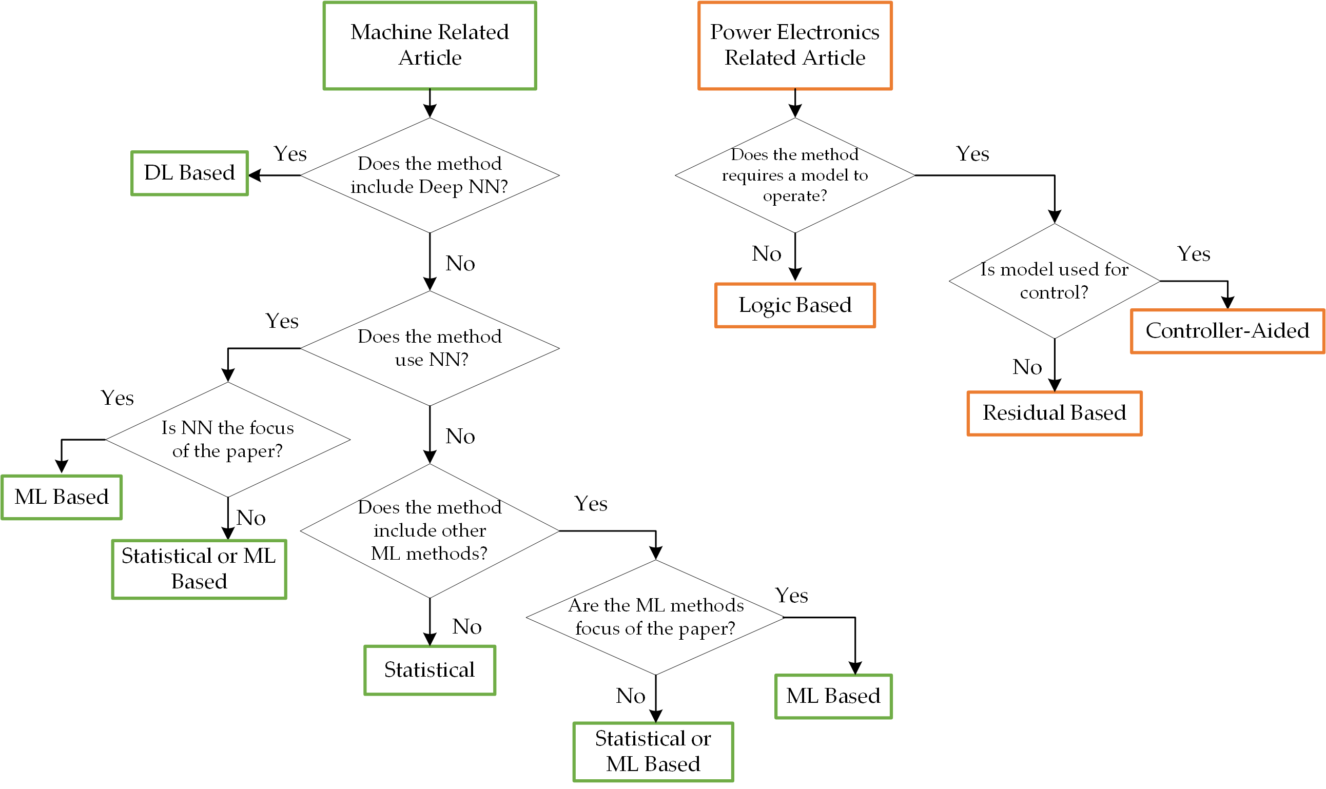 It is worth noting that the categorization of the methods is not always straightforward; some methods may fall into multiple categories while others may not fit into any of these categories. For example, in [17], the authors used wavelet transform on vibration signals to feed this information to a convolutional neural network (CNN) which falls into categories 1 and 3. In [32], graph theory is used and merged with k-nearest neighbor methods (kNN), which makes it hard to categorize. The categorization process is shown in Figure 1.