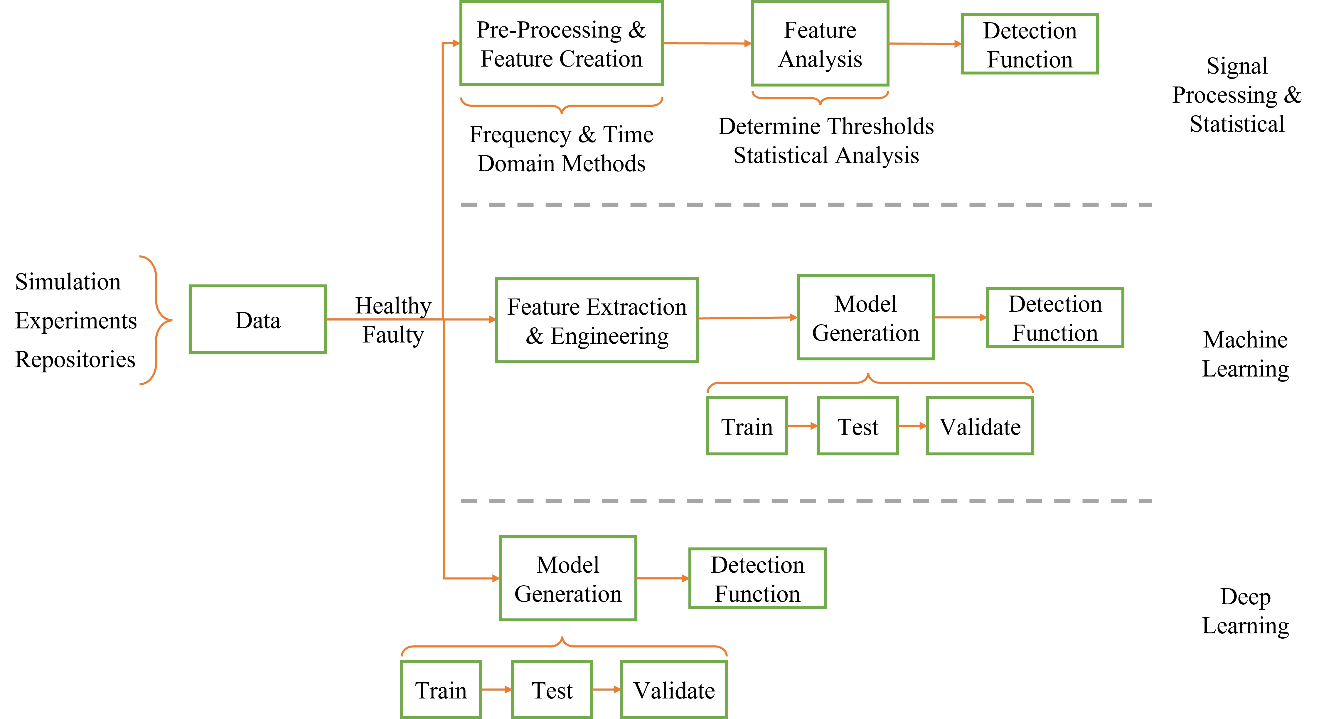 These methods can be generalized, as shown in Figure 4. Data for these three categories can be collected from experiments, simulations, or data repositories. These data include healthy and various faulty conditions. Later, based on the adopted method, fault detection is performed.