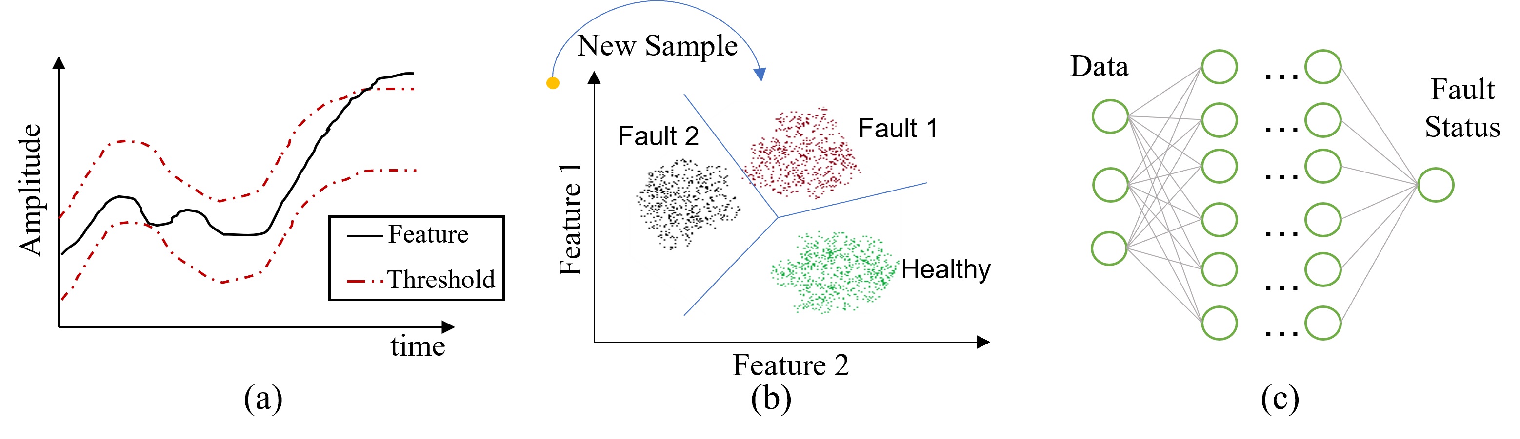 Detection can also be done in various ways. Three of the common ones are illustrated in Figure 5. Model-based or regression-based methods use certain thresholds for fault detection. All statistical methods and some ML methods also use this approach. The second detection method is using classification, which is used by ML and some DL methods. In detection by classification, each new sample is classified as healthy or as one type of fault. The third detection method is detection by NNs, which is used by some ML and DL methods. NNs are trained to give direct health information so no additional detection block is needed.