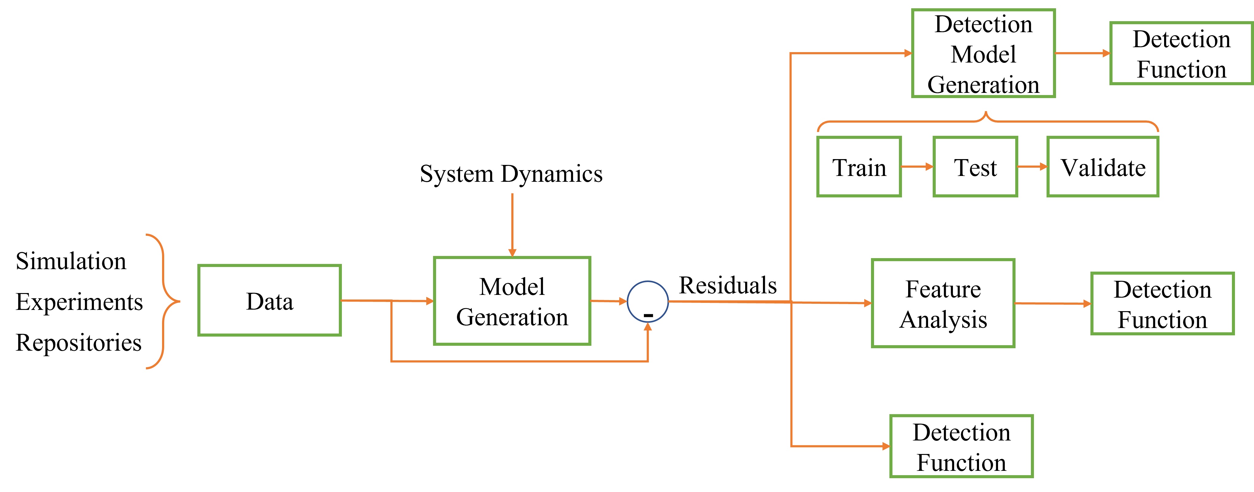 The second approach is called residual-based methods and they require a model generated from data or dynamic equations. The source of data can be simulations or experiments. Later, immediate measurements and model output are compared to calculate residuals [87–93]; hence, it is called residual-based methods. The model can be an ML model, a statistical , or a dynamical model. Figure 7 shows the model-based approach in FDD and how residuals can be utilized. A fair amount of papers that use ML can be found in this category, ranging from Bayesian networks to CNNs. As ML methods have an appearance, they are not applied for PE faults as widely as machine faults.