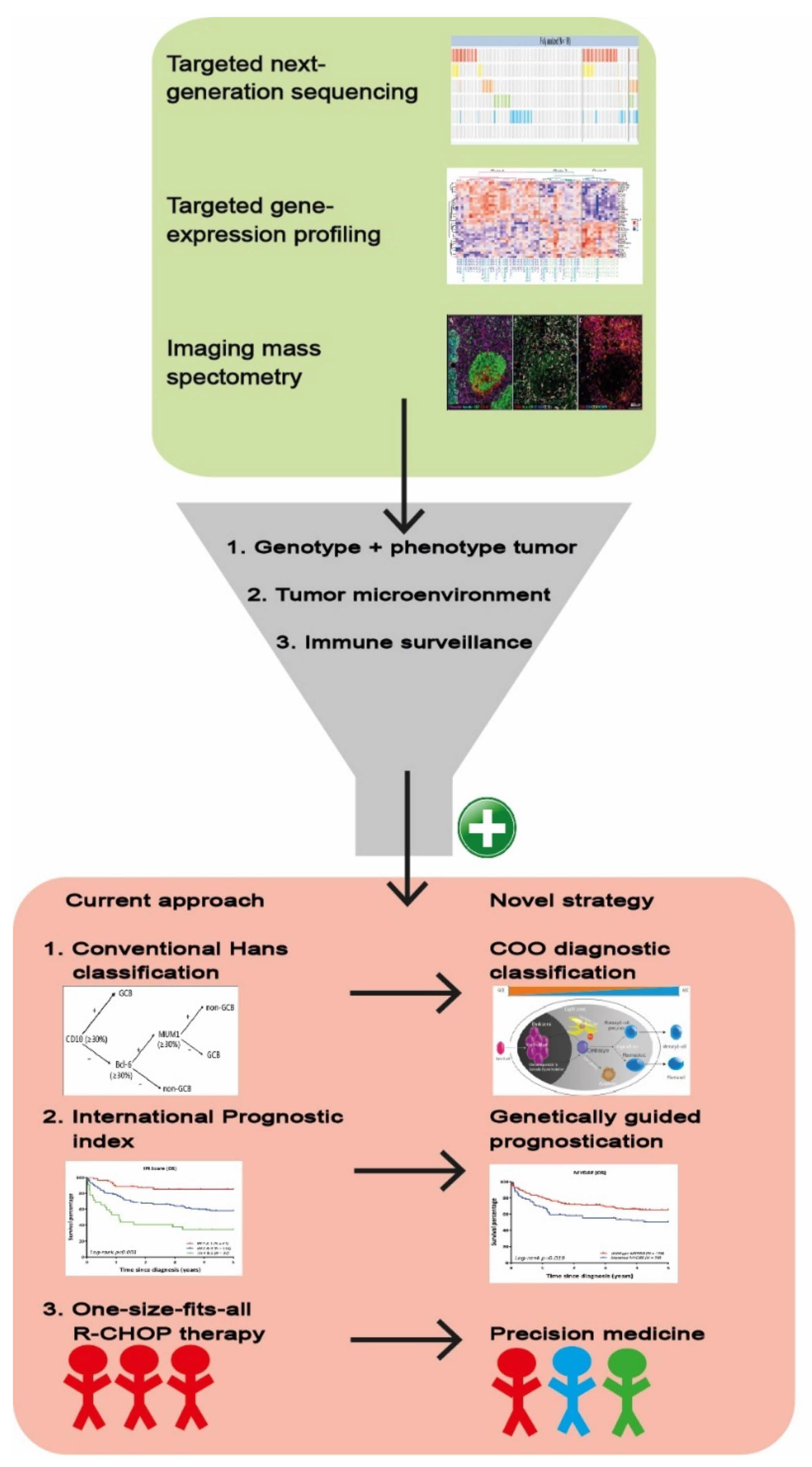 Figure 4. Schematic overview of a multilayered research strategy. Combining targeted NGS, targeted GEP and imaging mass spectrometry allows for inclusive analysis of genotype, phenotype, TME and immune surveillance of the DLBCL. This methodology substantiates the conversion from the current approach towards a novel strategy including (1) Hans classification to COO diagnostic classification, (2) a general clinical prognostic score (International Prognostic Index) towards a biology-guided prognostication and ultimately (3) facilitating development from a one-size-fits-all R-CHOP treatment towards more precision medicine.