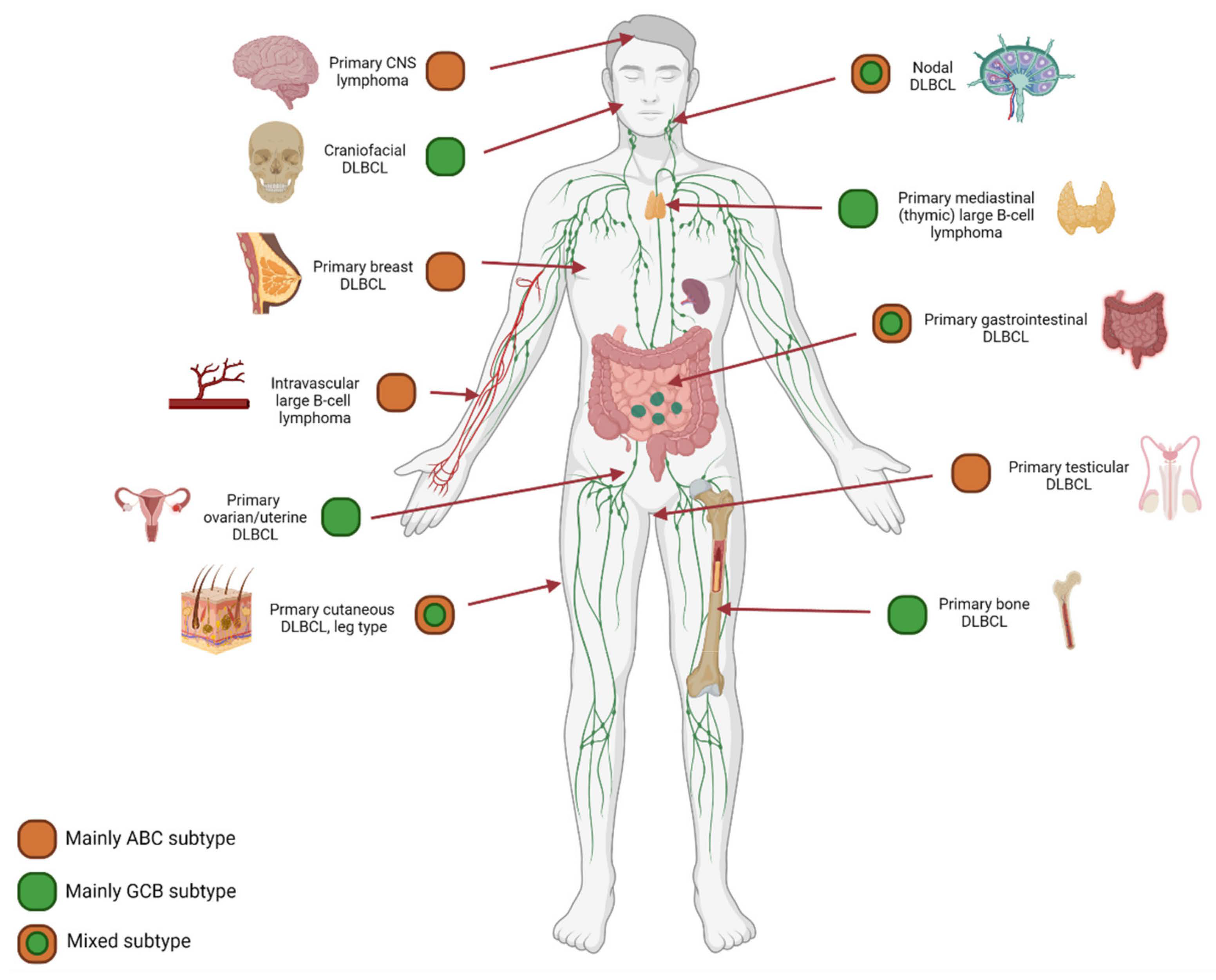 Figure 5. COO subtype: Anatomical localization matters. The results of diverse studies using GEP or Hans classification for COO determination demonstrated an evident association between anatomical preferred localization and COO subtype. For example, primary central nervous system lymphoma, primary testicular lymphoma, and intravascular large B-cell lymphoma harbor predominantly an ABC subtype. In contrast, we recently demonstrated a GCB subtype for primary bone DLBCL, that could be specified even further to unique cellular phenotypes [67]. This concept calls for additional investigation of well-annotated homogeneous cohorts of preferred localization DLBCL, including in-depth molecular studies.