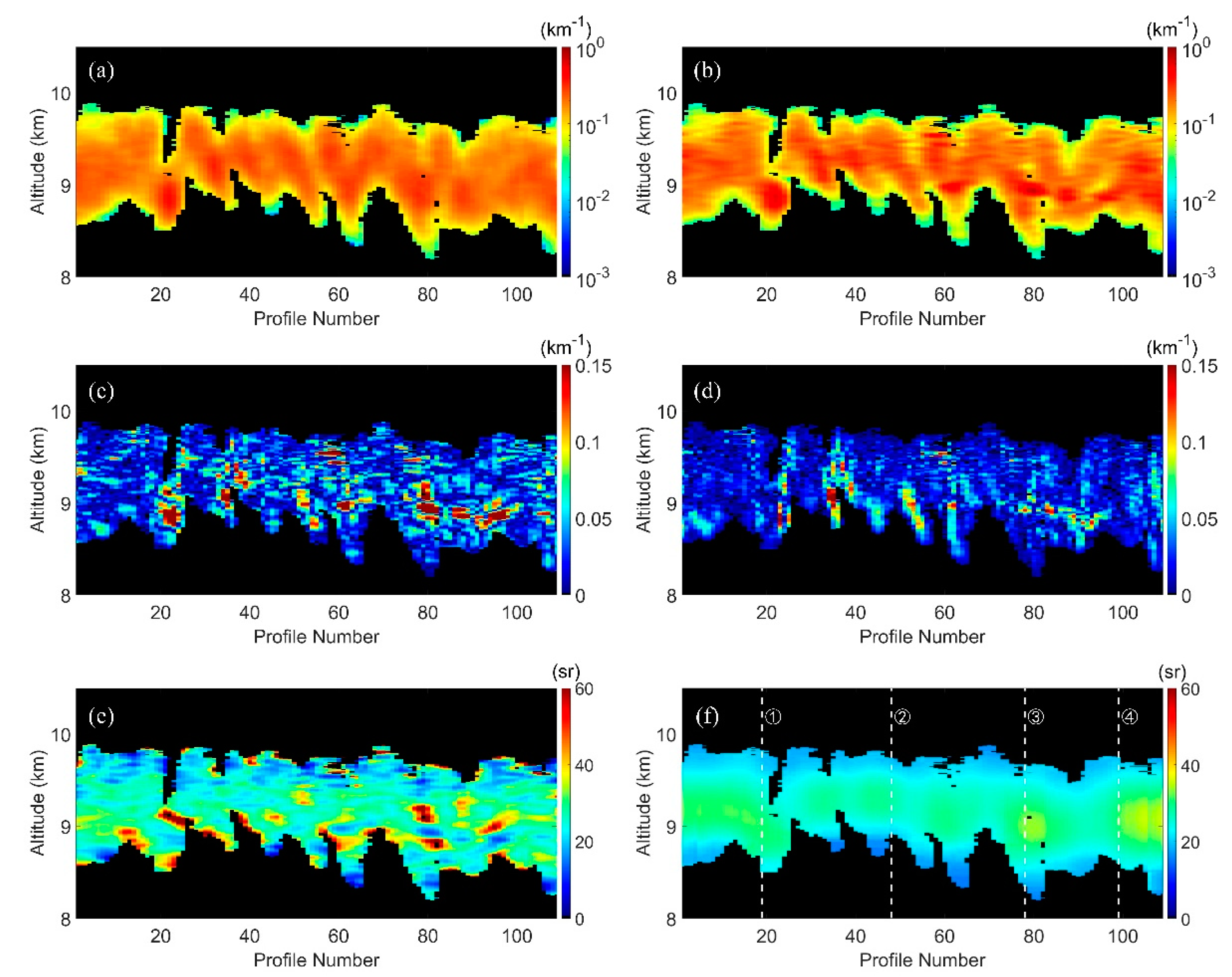 Figure 6. Comparisons of the results obtained by the standard method (left panel) and the IIR method (right panel) based on the simulation experiments. (a), (c), and (e) are obtained by the standard method, which represent the extinction coefficient, the absolute error of the extinction coefficient of the true values and the retrieval values, and the lidar ratio, respectively. (b), (d), and (f) are obtained by the IIR method. The dashed lines in (f) are selected for further analysis, whose profile numbers are 19, 48, 78, and 99, respectively.