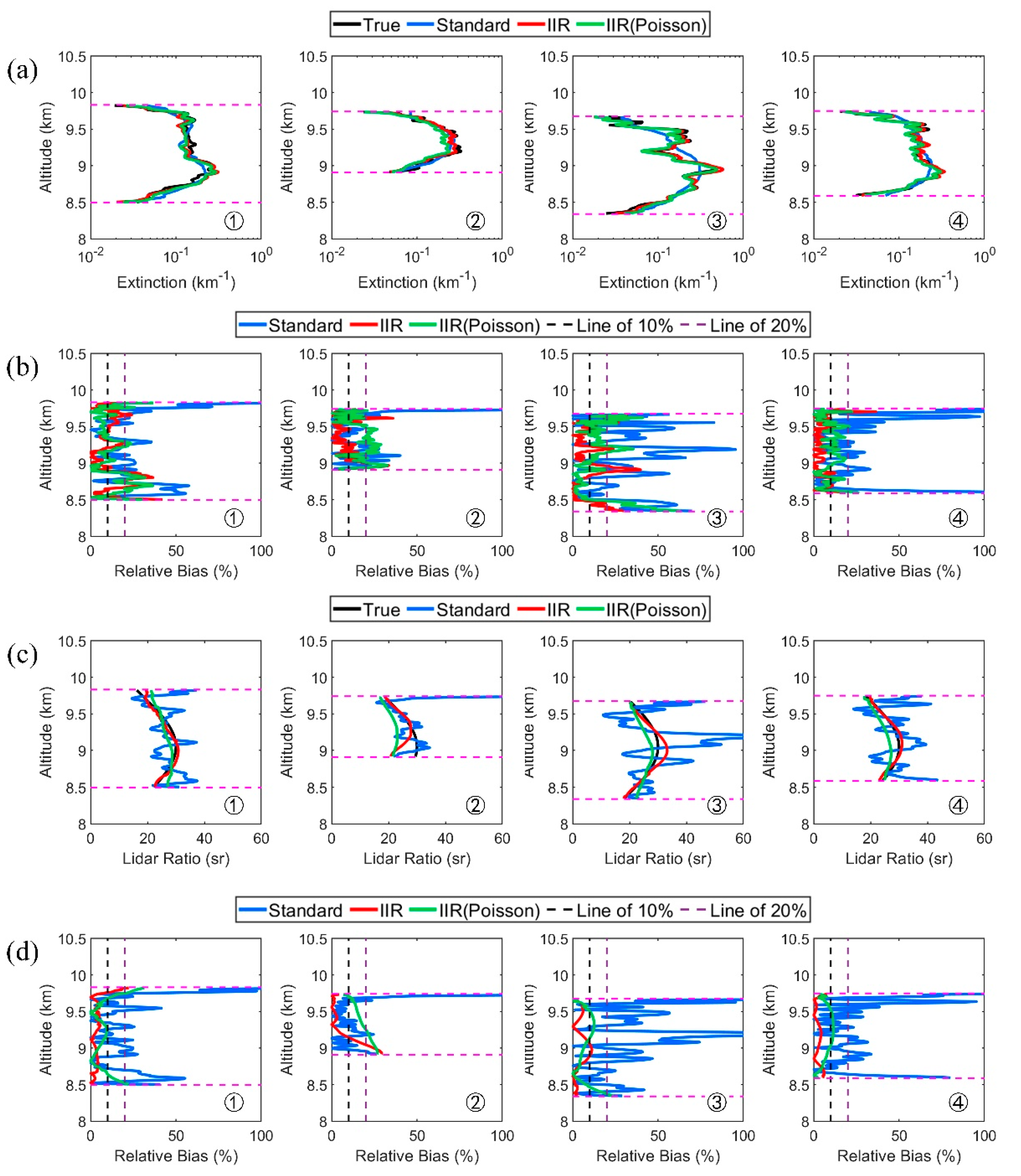 Figure 7. Comparisons of the extinction coefficient and the lidar ratio obtained by different methods. (a) The profiles of the extinction coefficient, whose profile numbers are 19, 48, 78, and 99, respectively. The lines in black are the true values, while the blue, red, and green lines represent the results obtained by the standard method, the IIR method, and the IIR method based on the Poisson model, respectively. The area within the dotted pink line is the valid area of clouds. (b) The relative biases of the extinction coefficient. The blue, red, and green lines represent the relative biases obtained by the standard method, the IIR method, and the IIR method based on the Poisson model, respectively. The black dotted line represents a relative bias of 10 percent, while the yellow dotted line represents a relative bias of 20 percent. The area within the dotted pink line is the valid area of the clouds. (c) and (d) represent the profiles of lidar ratio and the relative bias of the lidar ratio, respectively.