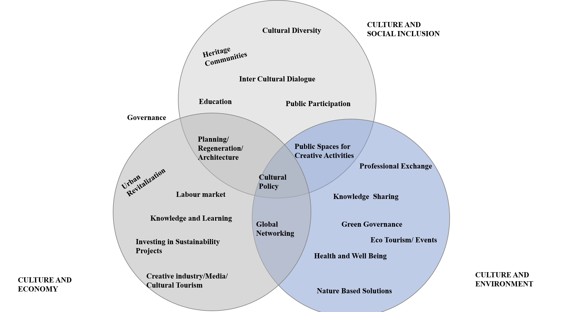 Cultural heritage plays a vital role in formulating action plans (Figure 1) for the modern city and increasing urbanization [10]. The publication of the New Urban Agenda is another notable document that has added more impetus to urban sustainability and culture [5, 8] and the inclusion of urban sustainability in policy frameworks such as the Sustainable Development Goals (SDGs). SDG No.11 explicitly calls for “making cities and human settlements inclusive, safe, resilient and sustainable” [5,11]. Scholars [12] have also focused on "Spaces of Possibility" (SoPs) and linked Institutional Innovations (II) as tools to investigate how cultural actors and urban policymakers might propose new approaches that emphasize the cultural component of sustainability through a selection of recent cases of urban cultural practices.