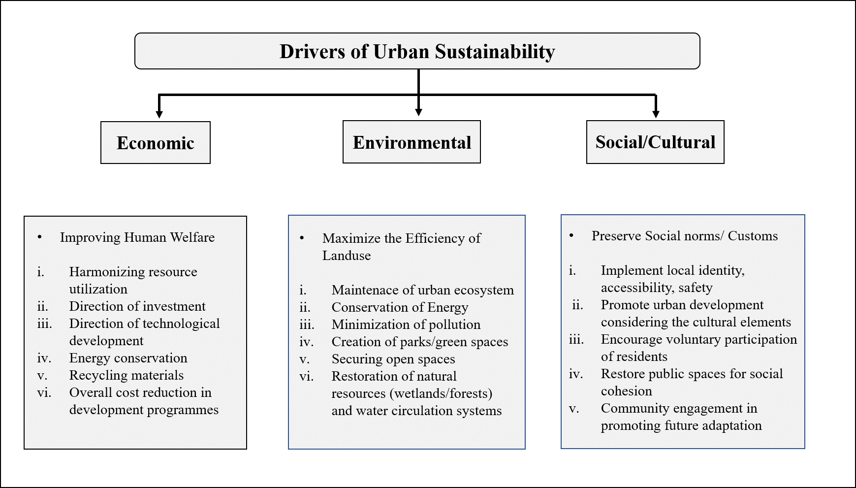 Wilkerson et al., [34] suggested a holistic approach to comprehend multidisciplinary endeavours and examine the need to enhance conceptual knowledge of the links between sustainable cities and development. This further demonstrates the significance of the multidimensional integration of social/cultural, economic, and environmental/climate variables in building sustainable urban models and policies.