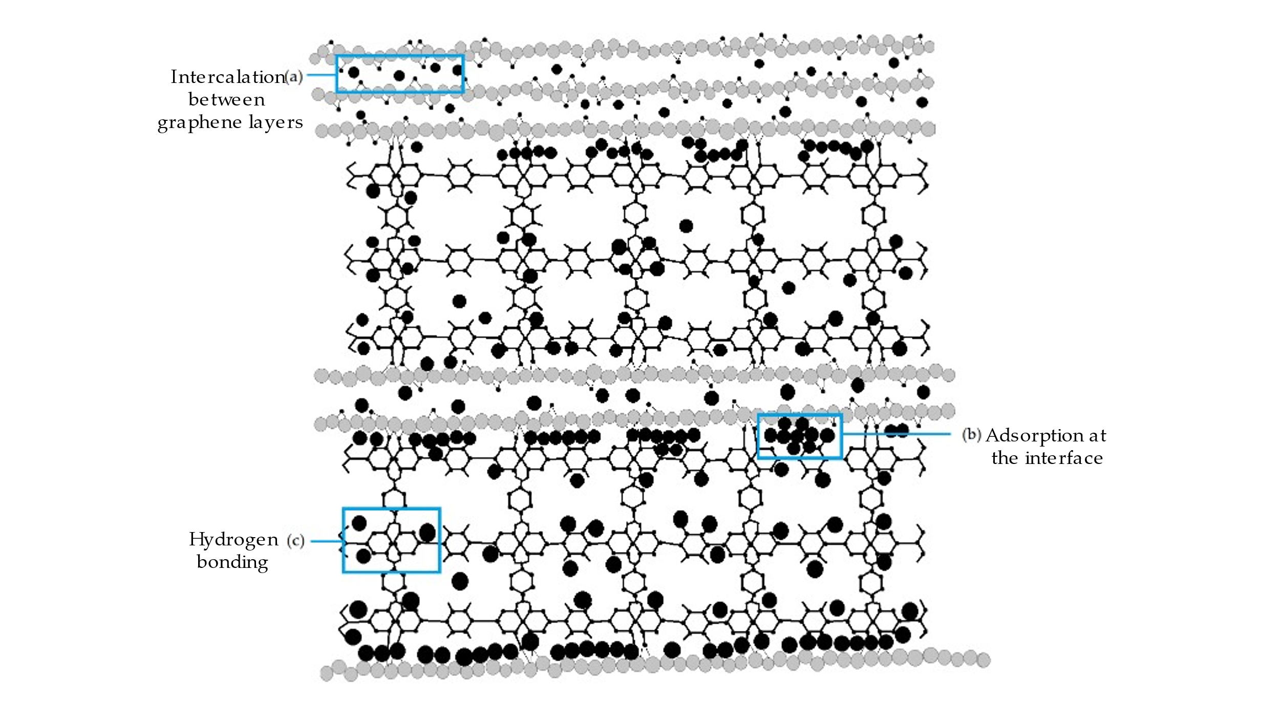 igure 15. Schematic representation of the adsorption mechanism of NH3 (black circle) in the composites, including (a) the intercalation between the graphene layers; (b) the adsorption at the interface between the graphene layers and the other segments; (c) hydrogen bonding with the oxygen atoms of metal oxides in the segments. Adapted with permission from [287]. Copyright ACS 2010.