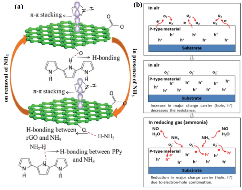 Figure 16. Sensing schematic interaction of (a) Ppy/rGO hybrid with NH3. Reprinted with permission from [299]. Copyright RSC 2018. (b) The sensing mechanism of the p-type material in air and reducing gas environments. Adapted with permission from [275]. Copyright IOPScience 2019.