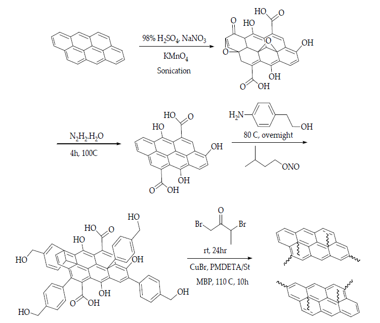 Figure 6. Schematic illustration of the fabrication of polystyrene-functionalised graphene nanosheets. H2SO4: sulphuric acid; NaNO3: sodium nitrate; KMnO4: potassium permanganate; N2H2.H2O: hydrazine monohydrate; NH2(C6H4)CH2CH2OH: 2-(4-aminophenyl)ethanol; CH3CH2(CH3)CH2CH2ONO: isoamyl nitrite; BrCH2COCH(Br)CH3: 2-bromopropionyl bromide; CuBr: copper bromide; PMDETA: N,N,N’,N’,N”-pentamethyl-diethylenetriamine; MBP: 2-bromopropionate [88].