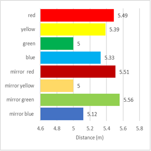 The first analysis of data relates to the influence of colour to estimation of distances with and without a rear-view mirror. Based on the results of descriptive statistics (Figure 3.) it can be concluded that the average distance for the colours yellow and blue shorter when test subjects estimate distance using rear-view mirrors, while the standard deviation is higher for any colour when the assessment is performed with the aid of rear-view mirrors (except for blue when equidistance). It can also be concluded that yellow is perceived as the closest by means of a mirror, then blue and red, and as the furthest green, while green is perceived as the closest without a mirror, then blue and yellow, and as the furthest red.