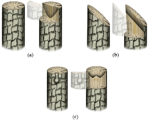 Figure 2. Typical wound-induced clogging up pattern in trees. The first and second images in each sub-figure represent wounding type/condition and virtual sectioning (for better visualization of the clogging patterns), respectively: (a) clean horizontal cut leads to clogging up of pith followed by side-by tissues; (b) oblique cut leads to the formation of the clogged-up barrier in parallelly oblique position; and (c) when there is a branch present beneath the cut surface, the clogging up occurs in such a way that the nutrient and metabolite flow to and from the branch would not be hindered.