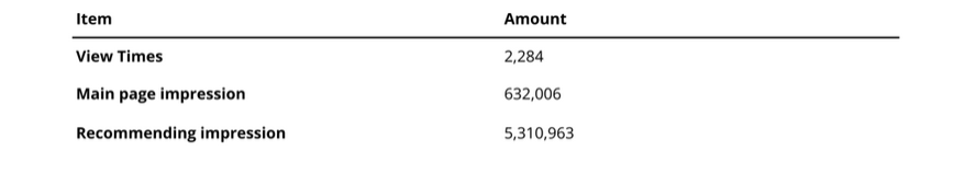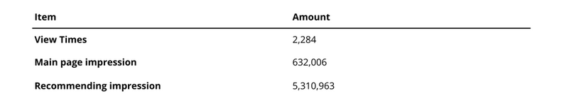 As shown in Table 2, the series recorded 2,284 view times. It gained prominent exposure via 632,006 main page impressions and secured extensive reach through 5,310,963 recommending impressions.