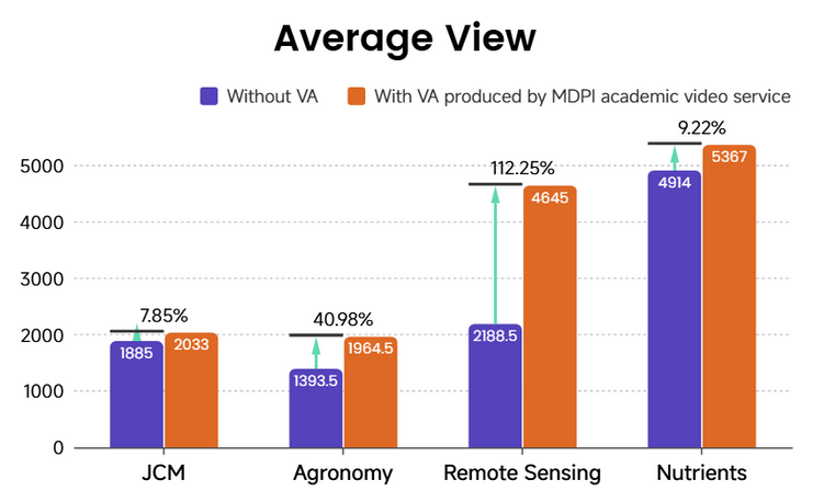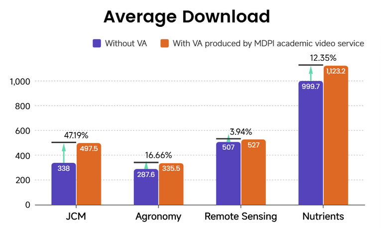 Figure 7. Comparison of average article downloads with and without VA support across four journals, showing consistent increases in downloads for video-supported articles, with relative uplifts ranging from 3.94% to 47.19%. All data was obtained from MDPI.
