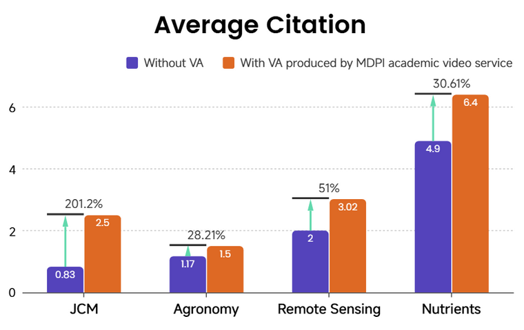 Figure 8. Comparison of average article impact metrics for articles published with and without MDPI Academic Video support across four journals, showing consistently higher values for video-supported articles. All data was obtained from MDPI.