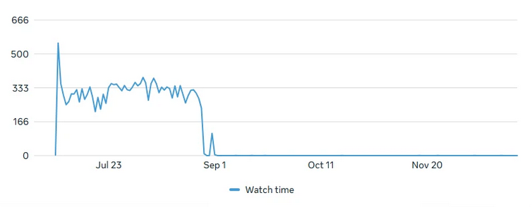 Throughout August and September, the watch time maintained consistently high performance, reflecting stable viewer interest and strong retention. The stability during this period suggests the content has lasting value and continues to attract views well beyond its release date. While a gradual decline is visible from October onwards—a common pattern for published content over time.