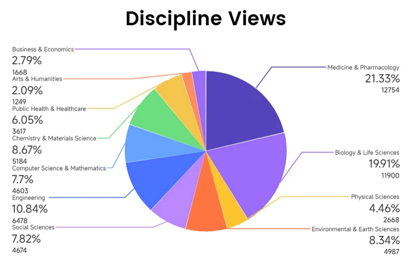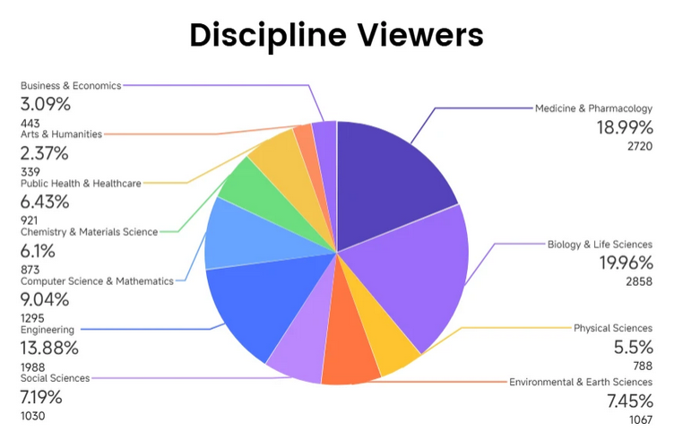 As shown in Figure 1, life sciences domains demonstrate the strongest participation, with Medicine & Pharmacology achieving the highest view times (12,754) and Biology & Life Sciences attracting the largest viewer base (2,858) while leading in interaction metrics. Engineering and Chemistry & Materials Science maintain solid mid-tier performance with 6,478 and 5,184 view times respectively. Environmental & Earth Sciences (4,987 view times) and Social Sciences (4,674 view times) show established audience interest, while Computer Science & Mathematics (4,603 view times) demonstrates consistent engagement (Figure 2). The findings indicate that scholars in medical, biological, and engineering fields are most active in watching video abstracts.