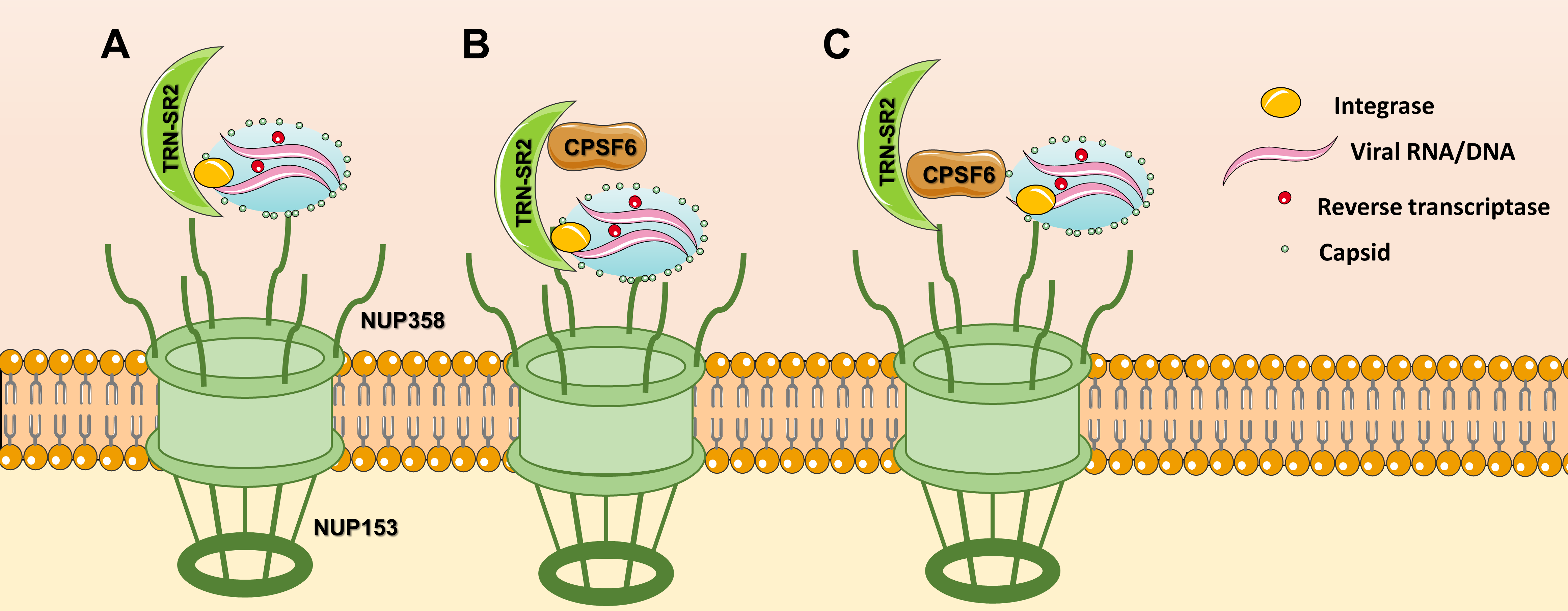 Figure 1. Nuclear import models for TRN-SR2: (A) TRN-SR2 can interact directly with HIV integrase, (B) Tsirkone et al. proposed a model where TRN-SR2 could accommodate both HIV IN and CPSF6 in a noncompetitive manner, (C) according to the third model, CPSF6 plays the key role in the interaction with the HIV PIC.