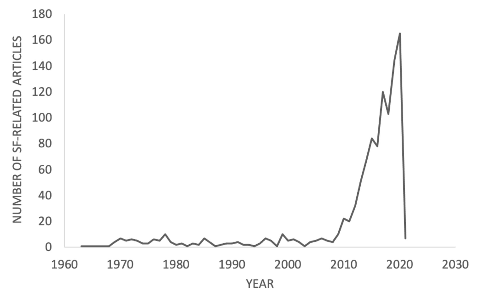 Figure 2. The number of singlet-fission(SF)-related articles published from 1963 until 2021.