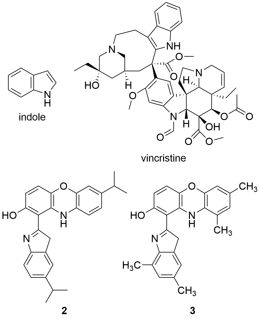 Recent studies have tested the activity by different derivatives with an indole group on different cancer cell lines. Indole groups are heterocyclic compounds formed by a benzene atom linked to a pyrrole compound, that have a pair of free electrons in the nitrogen atom of their aromatic ring. It is a fairly common component in perfumes, drug candidates and hormones (like melatonin)[84]. Some natural indole alkaloids, such as vincristine (Figure 5), has been accepted in USA by the Food and Drug Administration (FDA) as antitumor drugs[85].