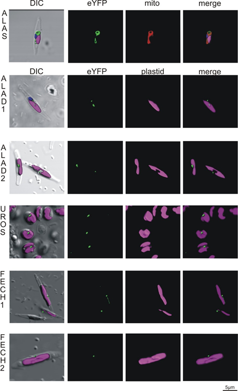 Figure 4. Heterologous expression of Phaeodactylum tricornutum with genes from Chromera velia heme pathway enzymes. Selected enzymes were tagged on their C-terminus by eYFP (green), magenta indicates plastid autofluorescence, MitoTracker® Orange CM-H2TMRos (ALAS, red) indicates mitochondrion. The Green eYFP signal of C. velia ALA synthase colocalizes with the red signal of P. tricornutum mitochondrion (row ALAS). Typical “blob-like” structures are found in heterologous expression of ALA dehydratases (ALAD1, ALAD2), uroporphyrinogen synthase (UROS), and both ferrochelatases (FECH1, FECH2).