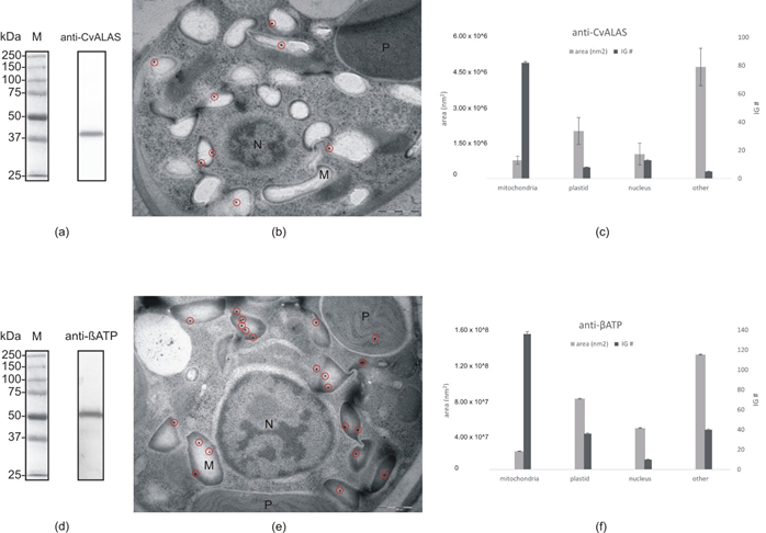 Figure 7. Immunogold labeling: (a) Western blot with anti-CvALAS on total protein extract from C. velia (b) Micrograph of C. velia ultrathin section after immunogold labeling with specific anti-CvALAS as a primary antibody. The majority of gold particles (encircled) were detected in the mitochondria. (c) Distribution of secondary IG particles (detecting anti-CvALAS) among cell compartments counted from all 35 micrographs. (d) Western blot with anti-βATP on total protein extract from C. velia (e) Micrograph of C. velia ultrathin section after immunogold labeling with specific anti-βATP as a primary antibody. The majority of gold particles (encircled) were detected in C. velia mitochondria. (f) Distribution of secondary IG particles (detecting anti-βATP) among cell compartments counted from all 35 micrographs. N = nucleus, M = mitochondria, P = plastid.