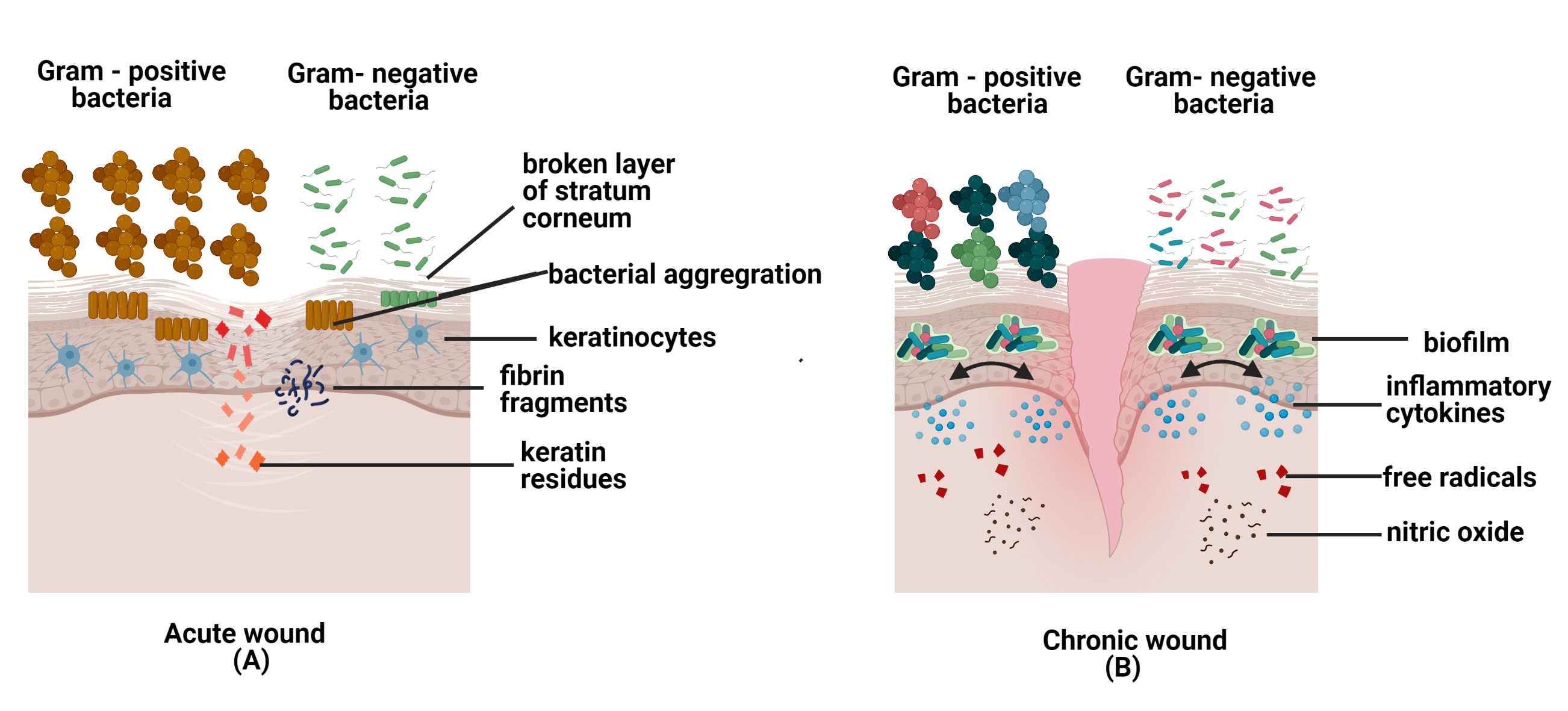 Figure 2. The figures above show microbes in acute and chronic wounds. (A) In acute wounds, fibrin fragments and keratin residues are favorable conditions for pathogens invasion into the skin. Hence, bacteria aggregate to prevent immune cells from destroying the bacterial community; (B) In chronic wounds, the biofilm formation secretes inflammatory cytokines, free radicals, and nitric oxide, which are toxic to cells and cell apoptosis.
