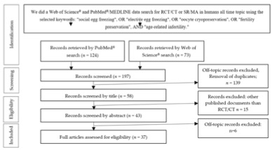 We performed a systematic qualitative review in the present study according to the Preferred Reporting Items for Systematic Review and Meta-Analysis (PRISMA) guidelines. For this purpose, we performed a preliminary search on Google Scholar. We systematically searched PubMed®/MEDLINE (http://www.ncbi.nlm.nih.gov/ PubMed, accessed on 15.01.2022 ) and Web of Science® databases for recent literature as systematic reviews (SRs), meta-analyses (MAs), (randomized) clinical trials (RCT/CT), and clinical case series (CCS) related to elective egg freezing.