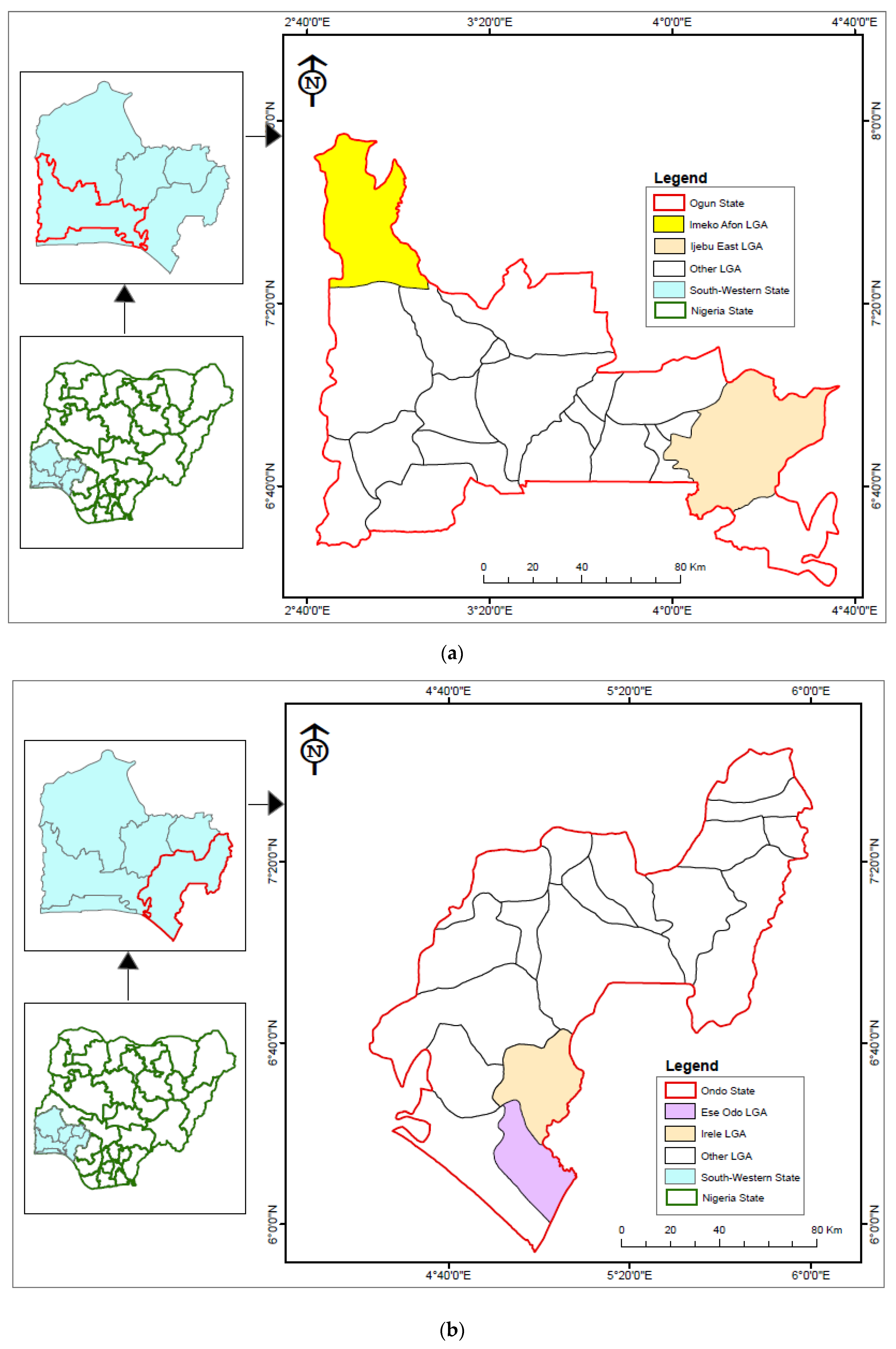 Figure 1. (a): Ogun State showing Imeko Afon and Ijebu East LGAs; (b): Ondo State showing Irele and Ese Odo LGAs; (c): Oyo State showing Iseyin and Iddo LGAs. Insert of Nigeria States and southwestern States.
