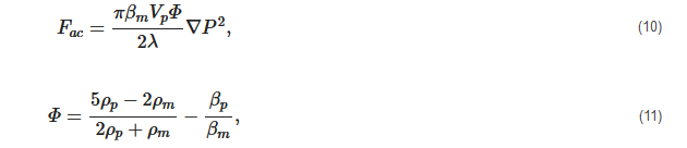 where β = 1/ρc2 is the compressibility, ρ is density, c is the speed of sound, Φ is the acoustic contrast factor, λ is the wavelength of the acoustic field, and P is the pressure distribution. The subscripts p and m refer to particle and medium properties, respectively. The pressure distribution for a one-dimensional standing wave is [113] P=Pocos(2πfx/cm), where Po is the pressure amplitude and f is the applied frequency.