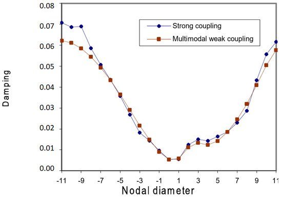 The stability of the bladed disk is assessed by calculating the aerodynamic damping for each IBPA for every single mode-shape oscillating at its natural frequency, as shown in Figure 4, from Mahler [26]. The method was historically implemented calculating the work per unit of a span on a number of 2D sections, using linearised aerodynamic theories. The process of assessing the overall stability by performing this worksum procedure was found to be ill-conditioned, the result being indicated by a small number, obtained as the algebraic sum of large numbers; the accuracy of the calculated damping was thus largely affected by the number of sections chosen. Today, with more computational power available, this approach and its many variants are implemented with 3D simulations and represent the state of the art in turbomachinery flutter analysis in the aerospace industry because of their simplicity. However, the fluid and structure domains are still treated as two separate media; thus, considerations and limitations of classical methods hold true. Examples of energy method applications are found in many works, including simulations of stall flutter and flows with large, separated regions, e.g., in [29]. The method is also used to compare the accuracy of coupled methods to well-known uncoupled formulations, as in [26,30,31,32,33]. Figure 5, taken from Mahler [26], plots aerodynamic damping versus IBPA for two different coupling algorithms.
