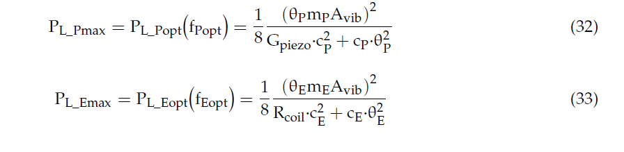 The maximum powers PL_Popt(fvib) and PL_Eopt(fvib) provided to the optimal loads, at a given frequency, can be obtained by substituting expressions (24) and (26) in (22) and (25) and (27) in (23):