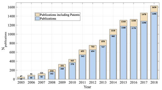 Vibration energy harvesters are emerging devices that are able to scavenge otherwise wasted energy from ambient vibrations. In the last years, vibration harvesters have been proposed for a large number of applications, such as industrial applications, medical implants, embedded sensors in buildings and bridges, regenerative suspensions for automotive applications and regenerative backpacks for wearable applications [1],[2],[3],[4],[5],[6],[7]. In particular, in the future, vibration harvesters could be fundamental for the development of Internet of Things (IoT) applications and for Industry 4.0 revolution. In fact, IoT applications adopt wireless sensor networks made of many wireless sensor nodes (small computing devices that are able to collect and transmit data to a base station). The required energy can be delivered to the nodes of a wireless sensor network by means of vibration harvesters [2],[5]. In this way, the nodes can become self-sufficient from the energy point of view and therefore the drawbacks of disposable batteries (environmental risks, limited reliability, need for replacement) can be strongly limited. The number of publications per year focusing on vibration energy harvesters is illustrated in Figure 1 starting from 2005. Figure 1 demonstrates the increasing scientific interest of researchers on such a topic.